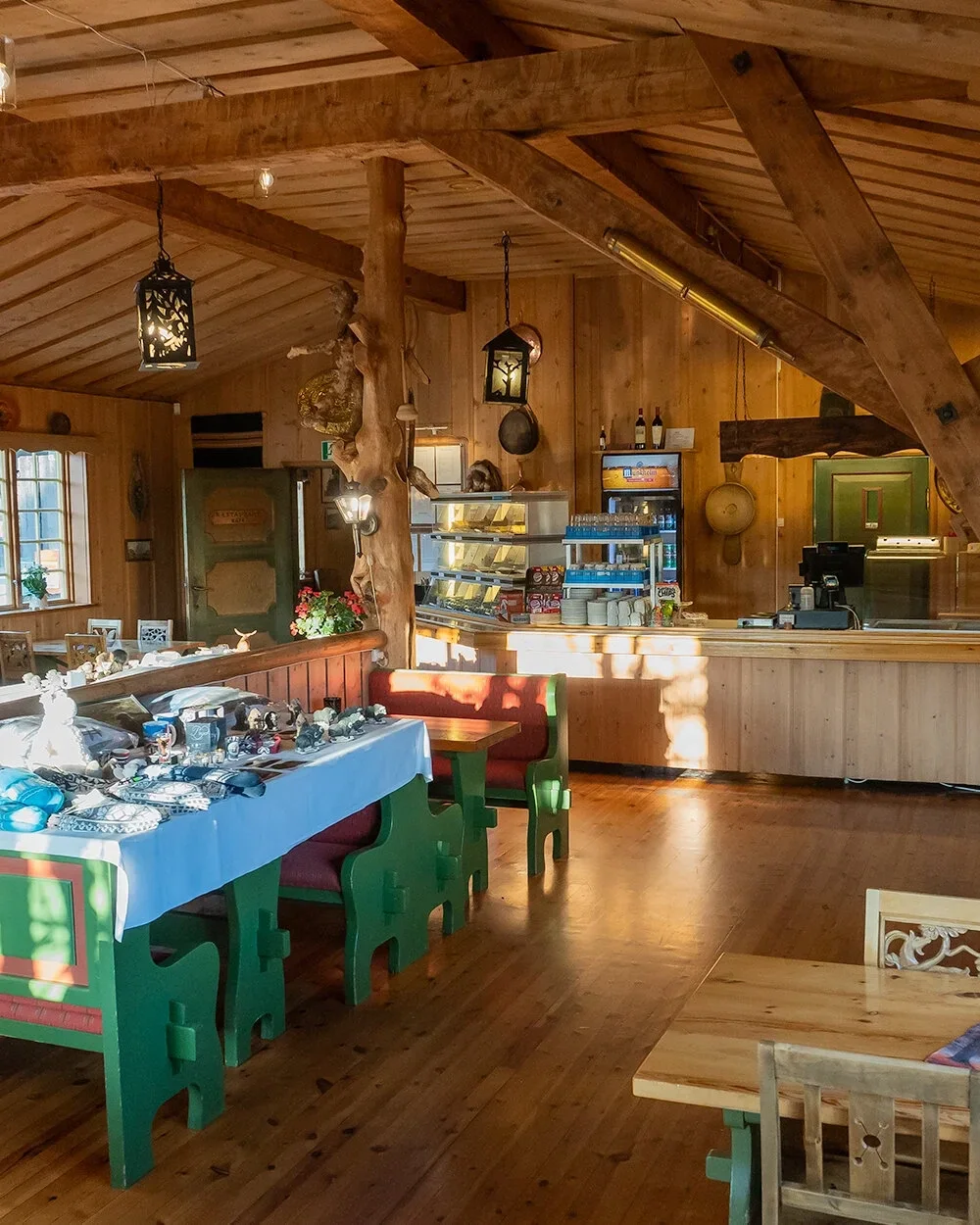 I kaféen er både gjester og gjennomreisende velkomne til smørbrød, varm mat og kaker, med ekte norsk tradisjonsmat i store porsjoner. For selskap tilbys “Hallen”, et herskapelig og koselig lokale med peis og kapasitet til opptil 50 gjester, der bord dekkes pent med festservise og det serveres mat, dessert, hjemmebakte kaker og kaffe.