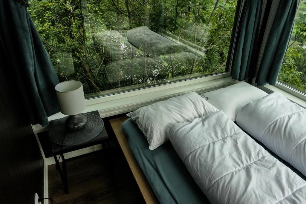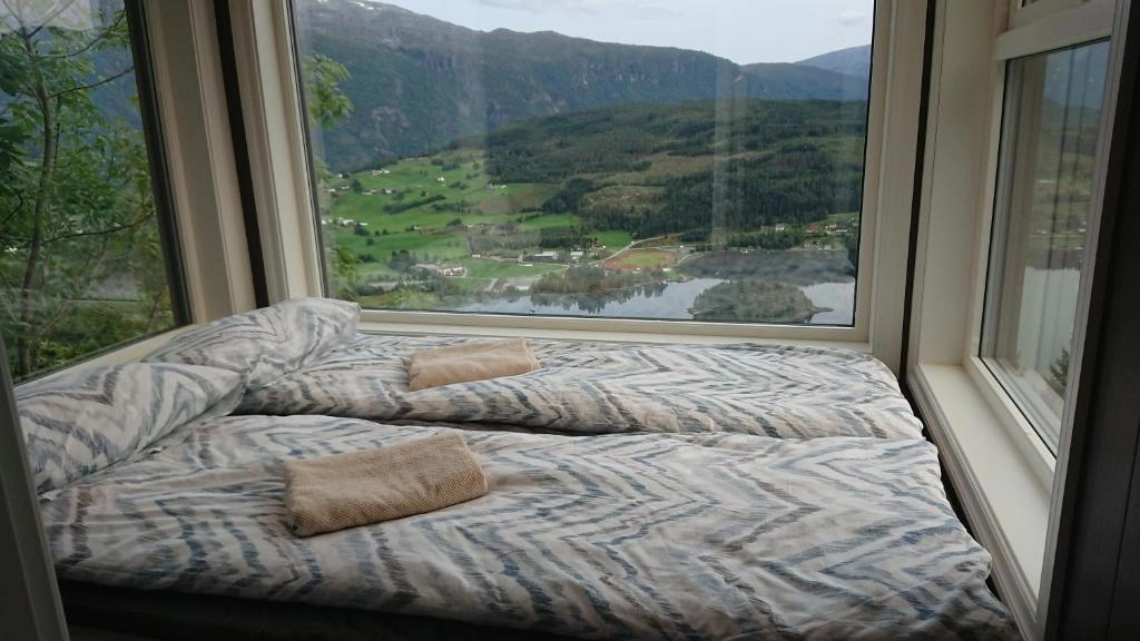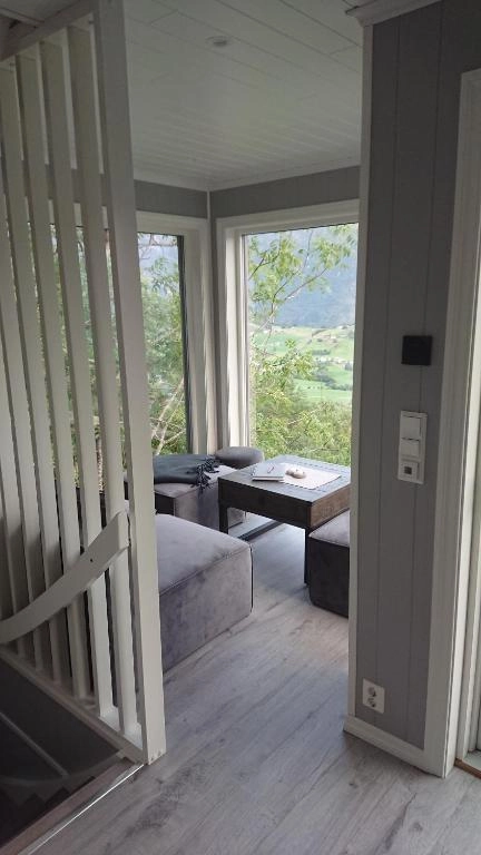 De store vinduene i stuen gir deg følelsen av å sveve fritt over landskapet og tilbyr en helt unik naturopplevelse.