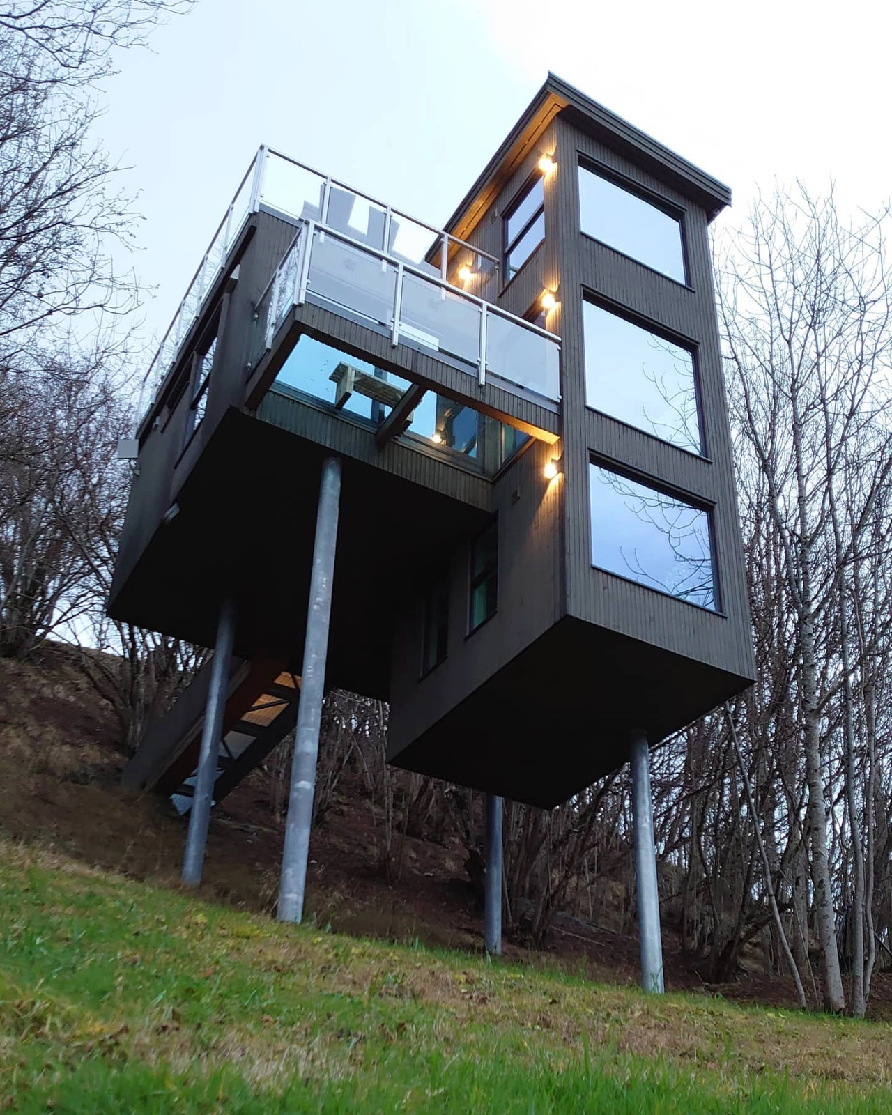 Hytta er bygget på søyler med en fantastisk panoramautsikt over Ulvik og Hardangerfjorden.