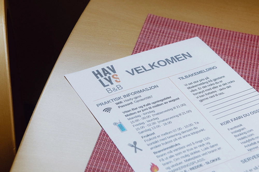 Våre 13 rom, alle med eget bad, gir deg en komfortabel base for å utforske de fantastiske omgivelsene. Nyt en avslappende stund i vår peisstue, eller start dagen med en deilig frokostbuffet servert mellom 08.00 og 10.00. I sommersesongen kan du også besøke vår in-house Havlys Bar & Kafé, som byr på forfriskninger og hyggelig atmosfære.