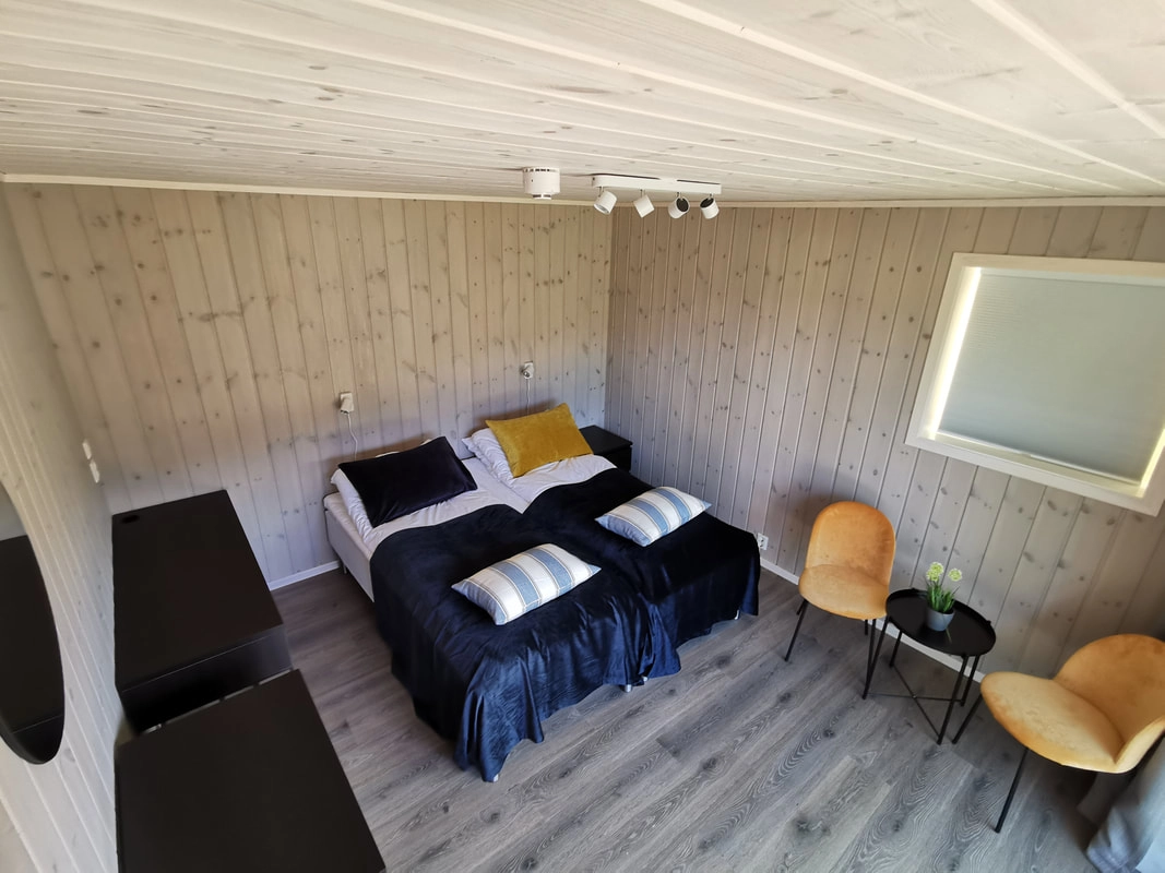 Skomakarhuset (60 kvm) er eit sjarmerande timmerhus med fem sengeplassar fordelt på tre soverom, bad, kjøkken og fasilitetar til stell og oppbevaring av fisk.
