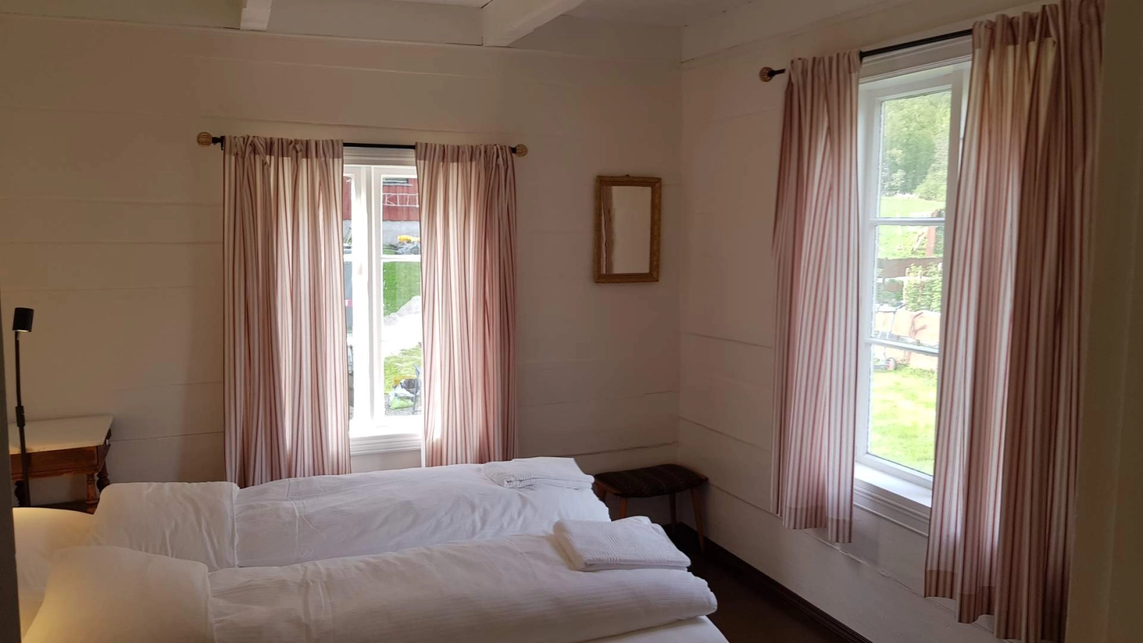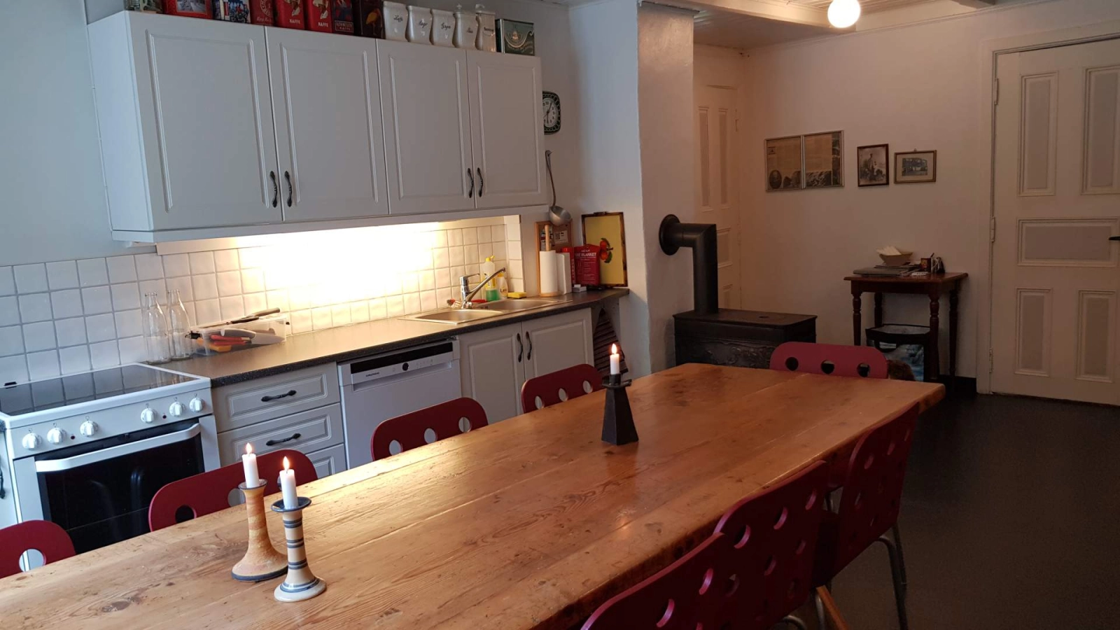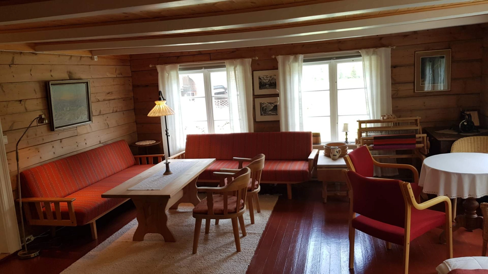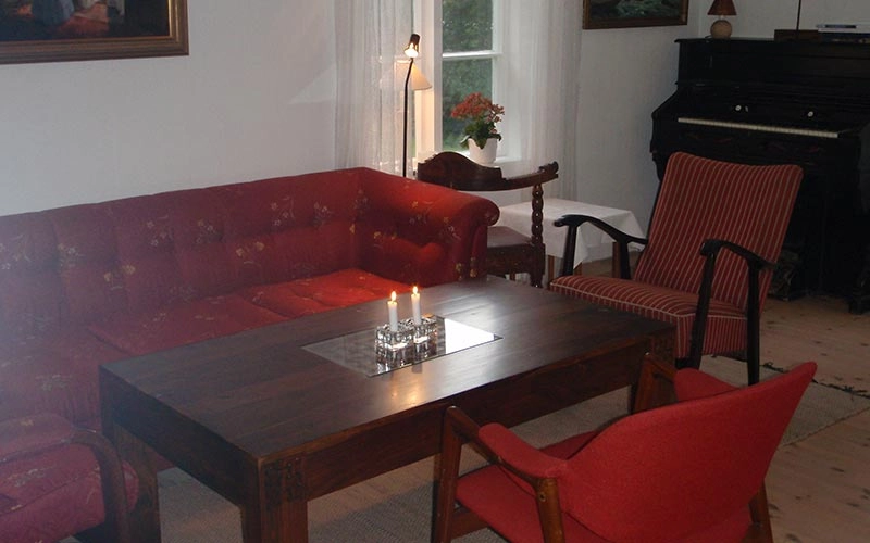 Våningshuset er fullt utstyrt med kjøkken og spiskammers, og har hele tre stuer. I tømmer-spisestua med gamle, fine møbler kan vi dekke på til bortimot 30 personer. Sengetøy og håndklær er inkludert.