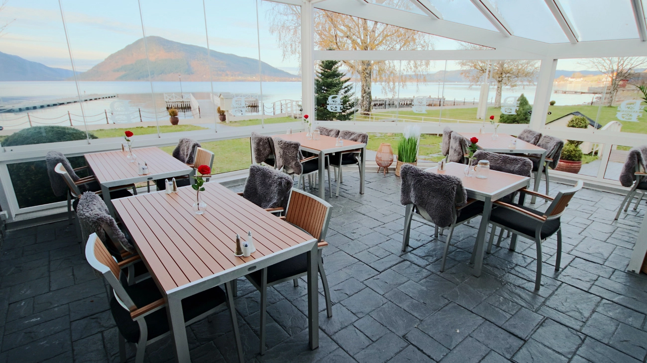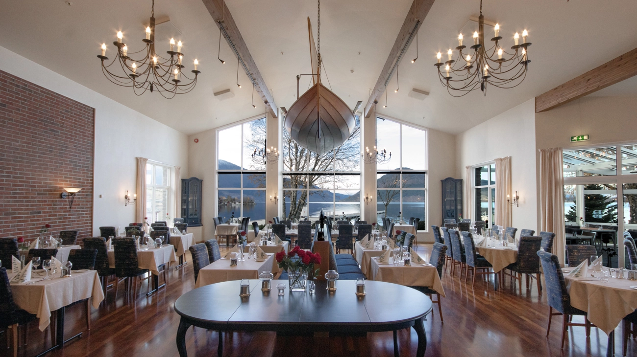 Hotellets restaurant med plass til 250 gjester gir deg en fantastisk fjordutsikt Kjøkkenet serverer både lokale og internasjonale retter, og det finnes en hagestue med utsikt til parken og fjorden.