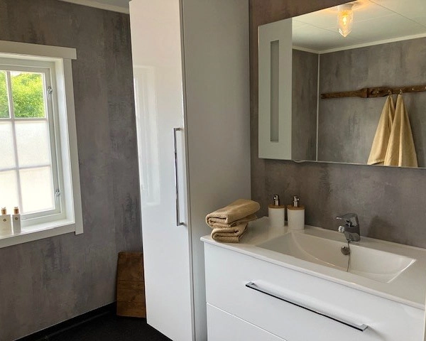 Sjøbuda Ramoen har fire soverom med dobbeltsenger og to bad, alt nytt og delikat. I tillegg finnes en leilighet med to soverom (dobbeltseng + køyeseng), liten kjøkkenkrok og eget bad. Som gjest kan du bruke fellesareal inne og ute, med romslig uteplass og stort spisebord – nyt solnedgangen eller fisk dagens middag.