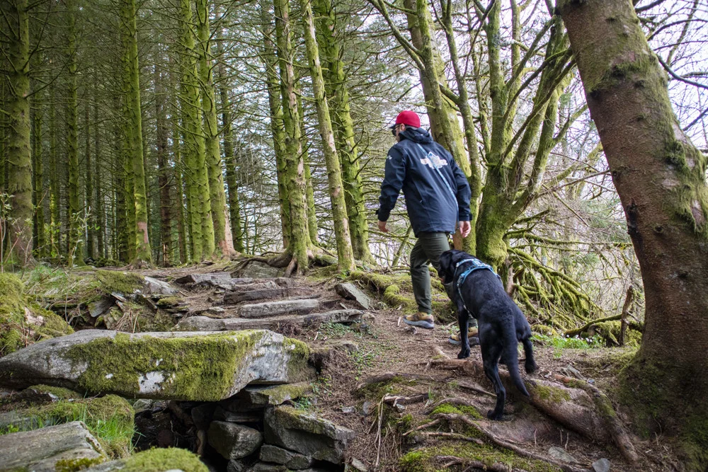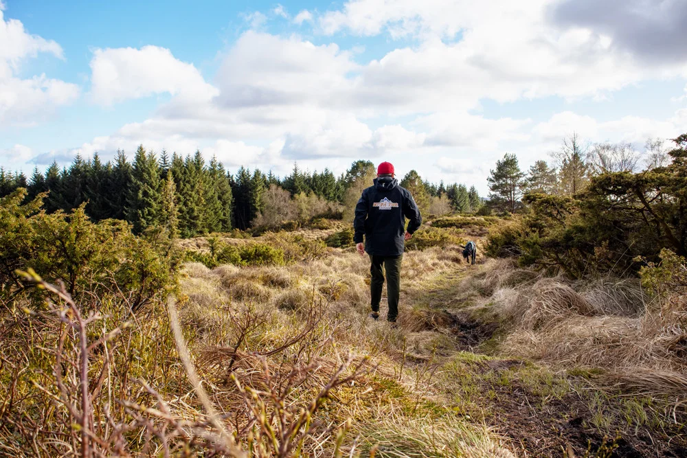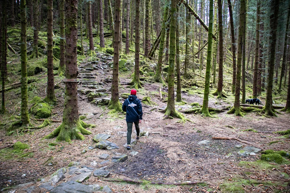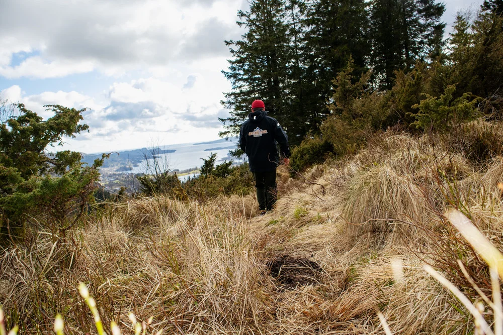 Gå inn her og opp tretrappen på høyre side. Det er skilt og merket. Gå stien gjennom granskogen til du kommer til en stor lysning.