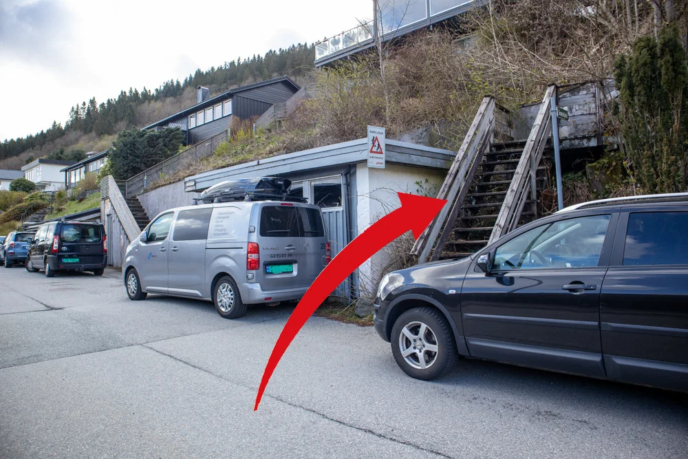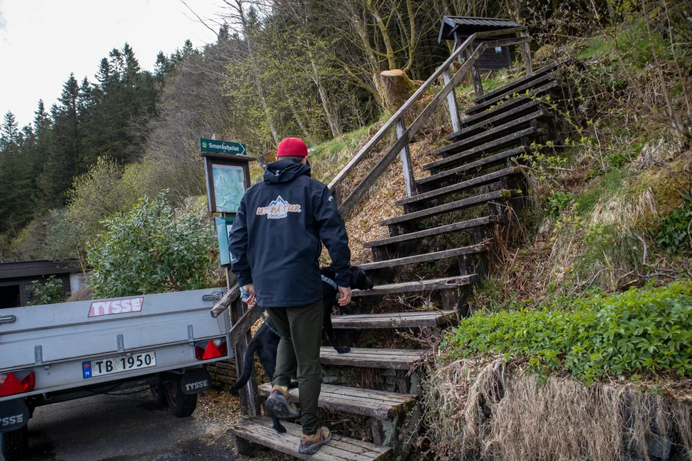 Like etter bakken ser du en tretrapp med grønt skilt merket "Smøråsen". Gå opp trappen og følg stien til du kommer opp igjen på Hatlestad terrasse. Følg veien ca. 200 meter til nytt skilt på venstre side.