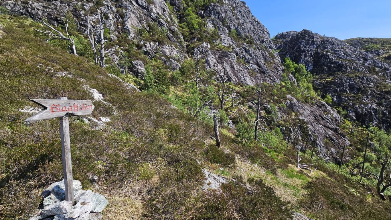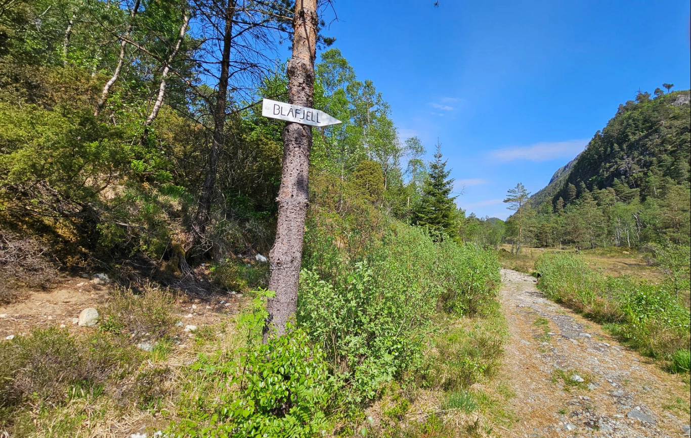 Du kommer til et nytt skilt merket "Blåfjellet". Like etter kommer et lett klyveparti før du kommer opp på fjellryggen. Den siste delen går på flatt fjellterreng inn til Flåfjellet.