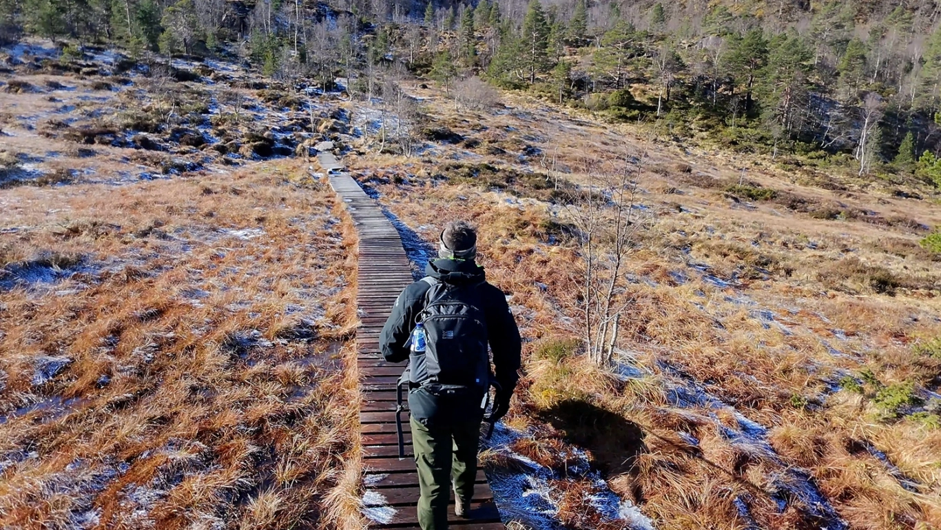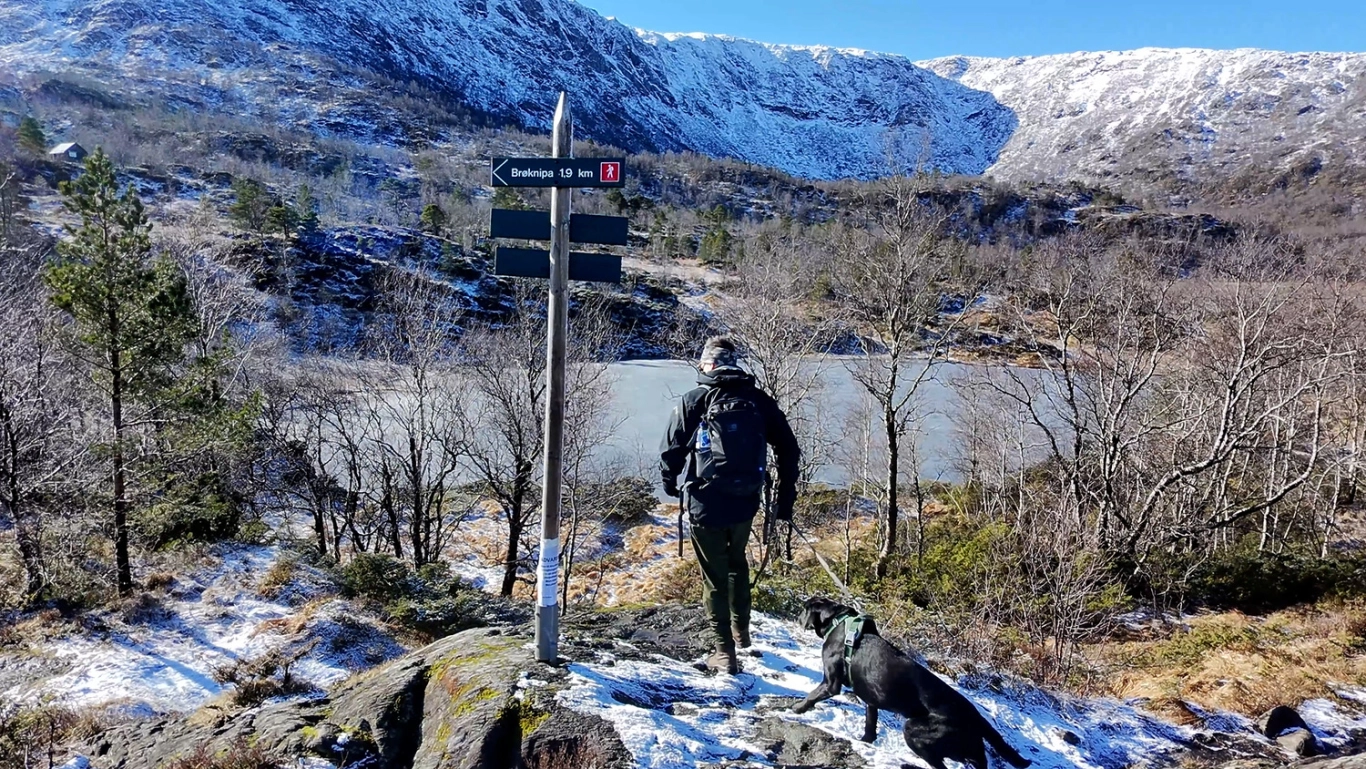 Turen starter på Byrkjeland, hvor det er parkering langs veien og et stort skilt s...