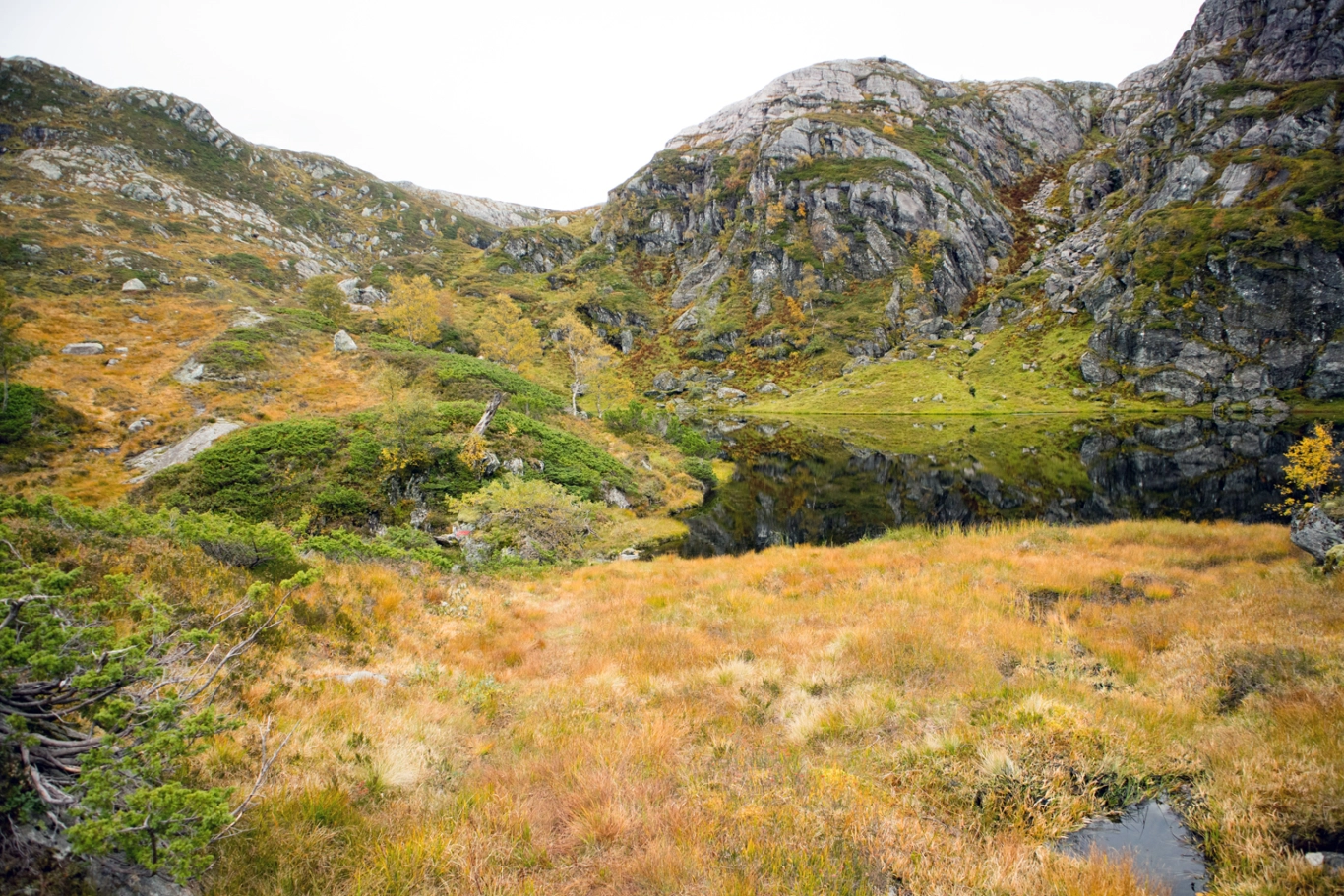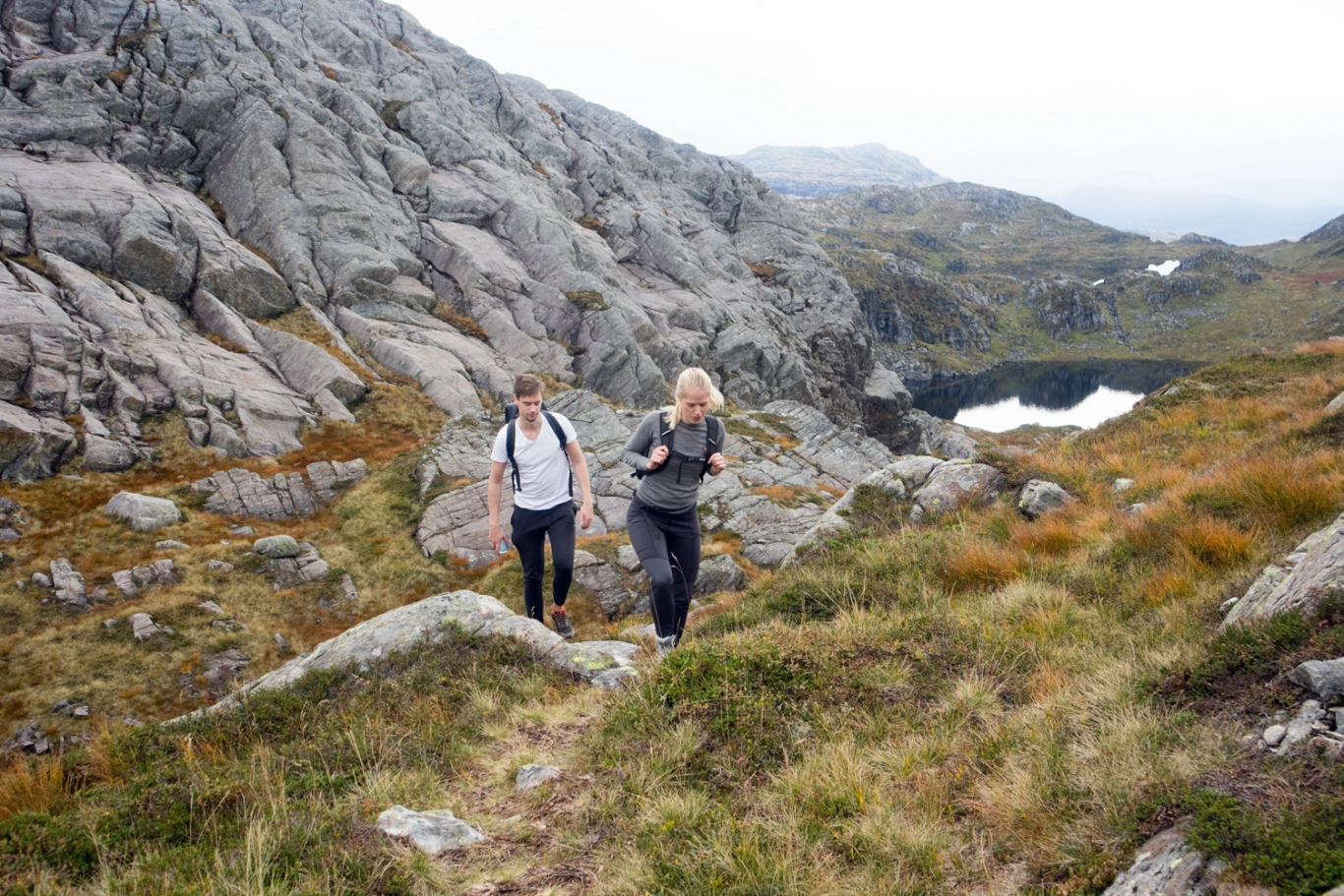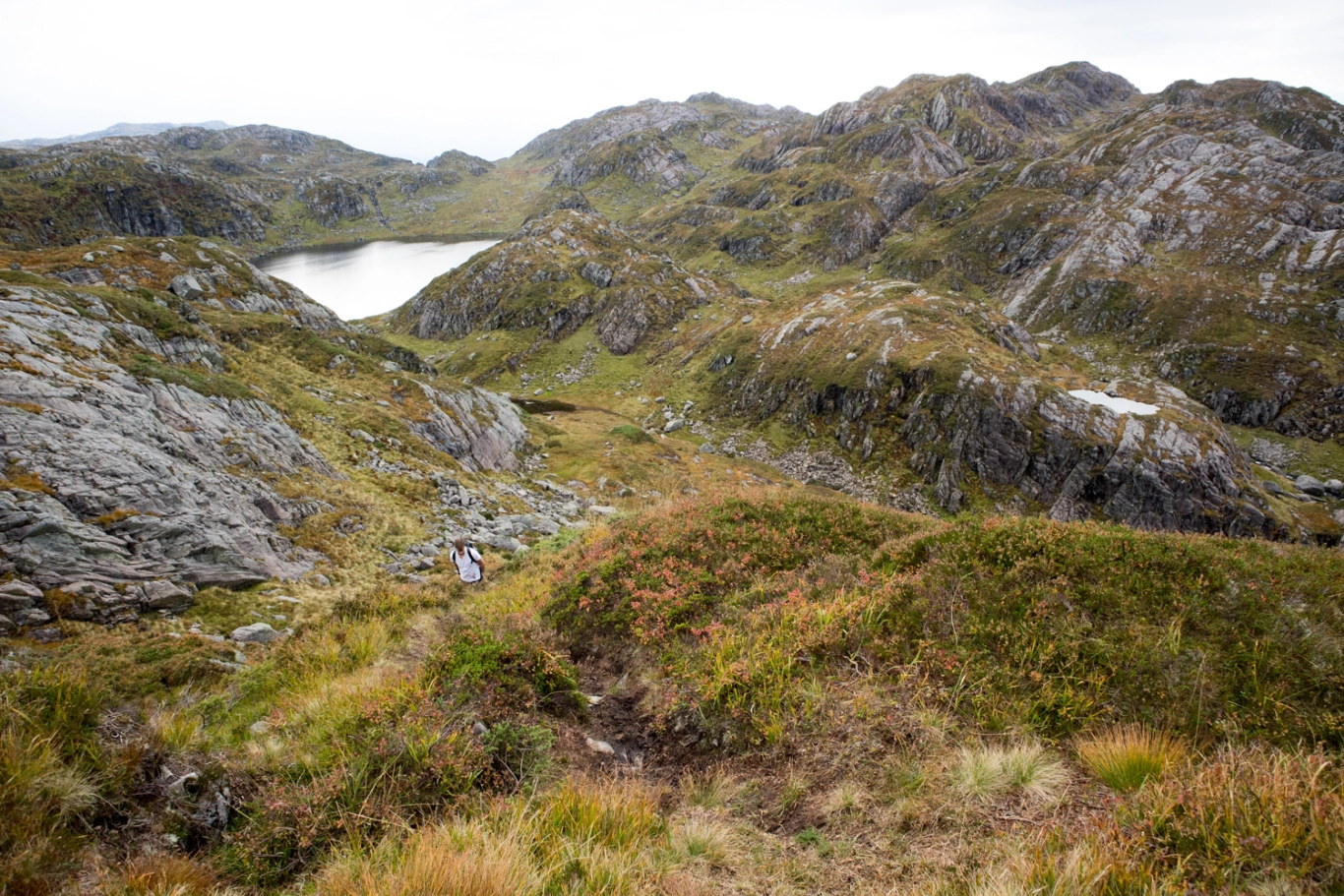Gå samme vei tilbake. Det er mange myrete partier så høye fjellsko anbefales.