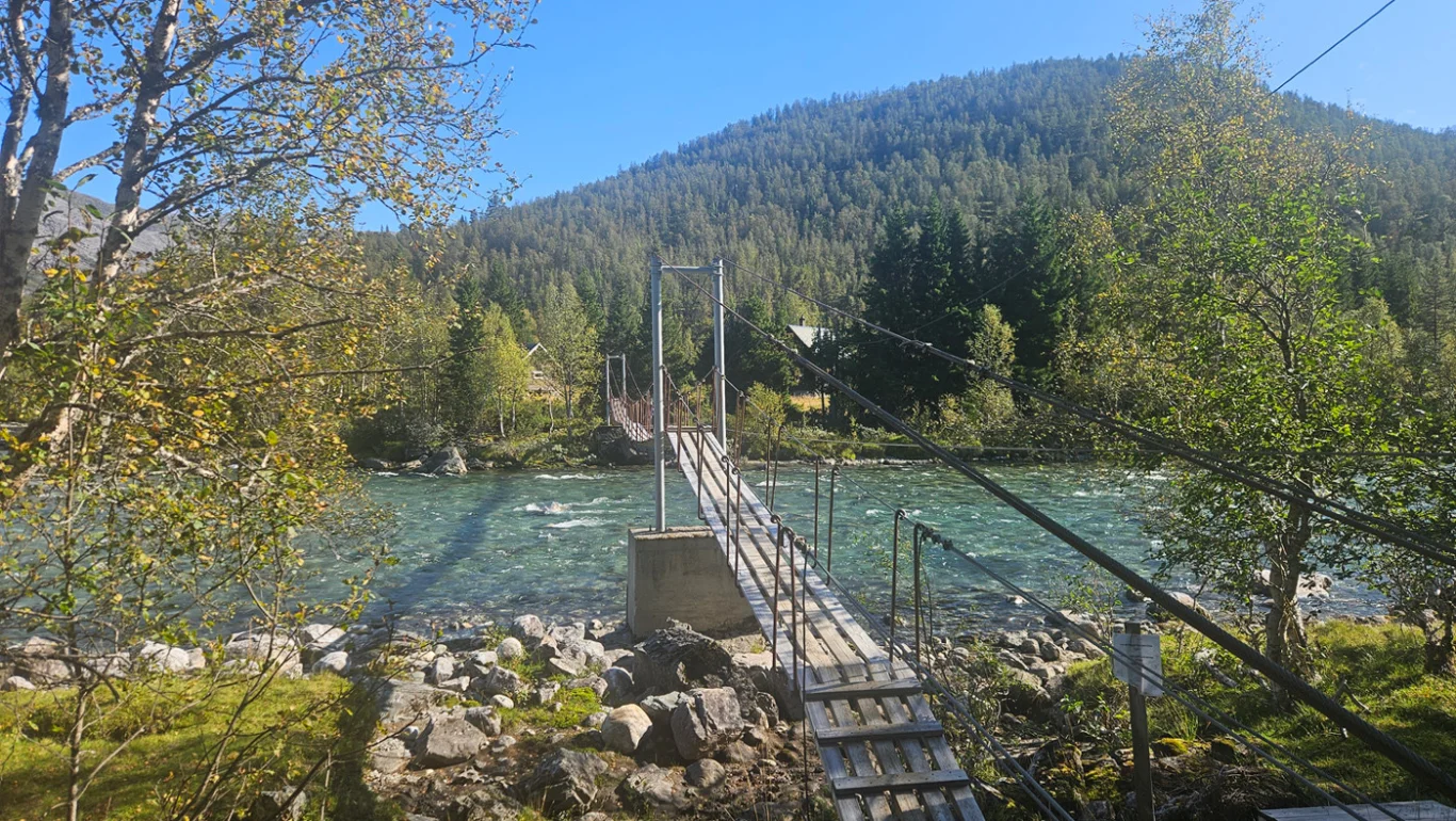 Om du kjører til Mjølfjell: Parkering på p-plass like før hengebroen ved elven.