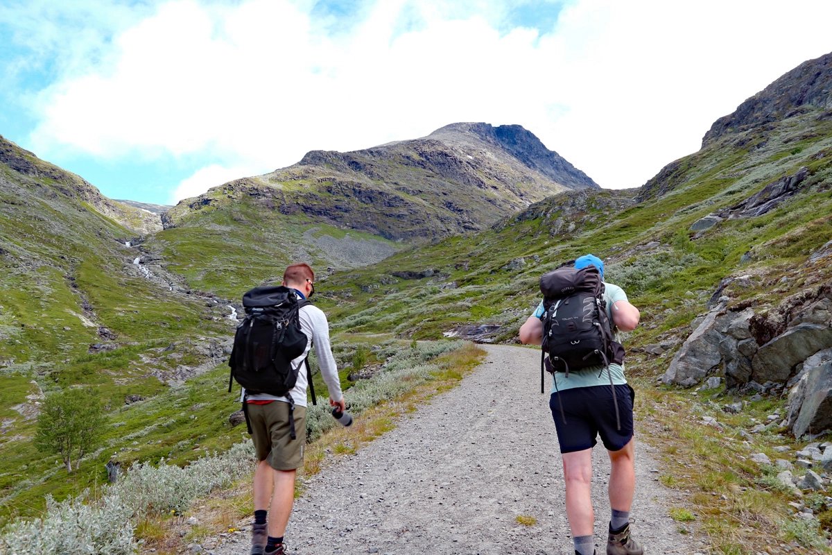 Gå på grusvei gjennom Utladalen med elver og fossefall på hver side opp til Vetti ...