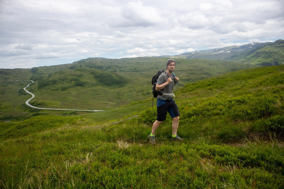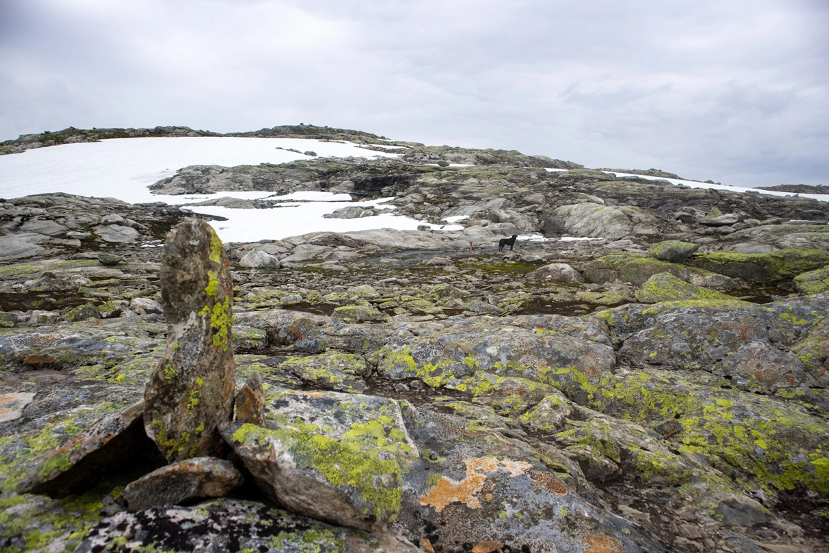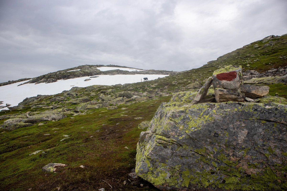 Herfra blir stien dårligere. Du skal opp på ryggen på din venstre side. Gå opp mot sør til du kommer opp på ryggen. Du kan se en mini varde som markerer et utsiktpunkt. Oppe på ryggen føler du den mot sør-vest. Terrenget er for det meste flatt, men noen steder går det ned i dumper. Det er ikke noe markert sti her så man må følge terrenget. Gå vestover opp på neste platå. Her er det bratt, men du vil se sti/dyretråkk mot høyre. Når du kommer opp kan du se Finnbunuten varden i det fjerne.