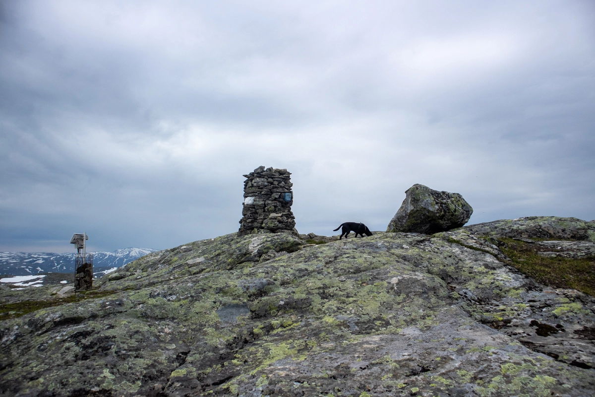 Nå flater terrenget ut. Gå mot vest og kryss mellom to vann. Fortsett videre rett frem og du kommer inn på merket trasé mot Finnbunuten. Litt usikker på hvor denne merkede stien kommer fra, men vil tror den går fra skitrekket i Myrkdalen. Følg rød merking (stein og trepinner) til toppen. Du kan se varden på god avstand.
