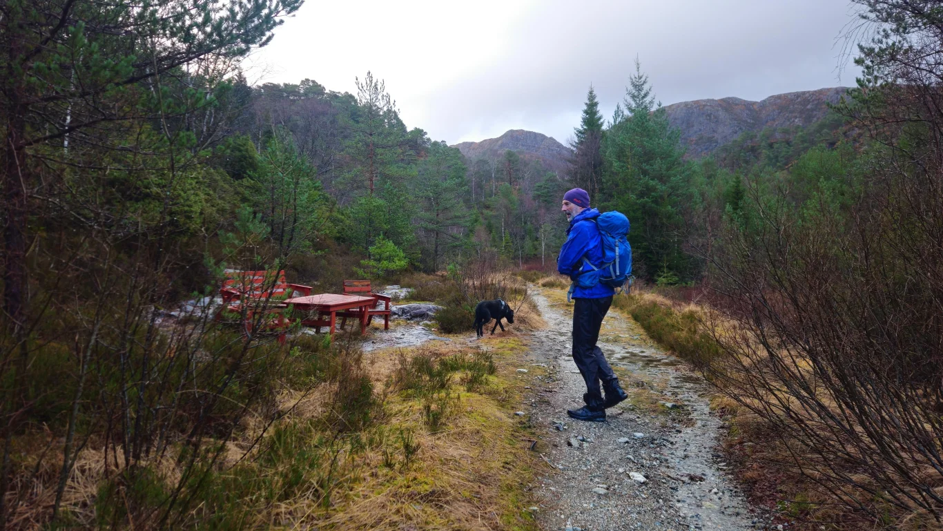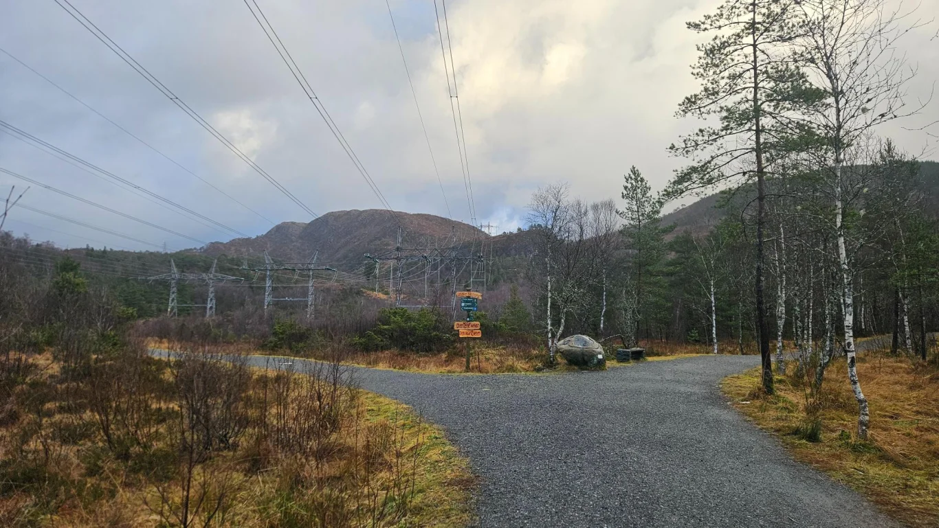 Start turen fra parkeringen ved Myrdalsvatnet. Følg grusveien langs vannet til du kommer til et veikryss.