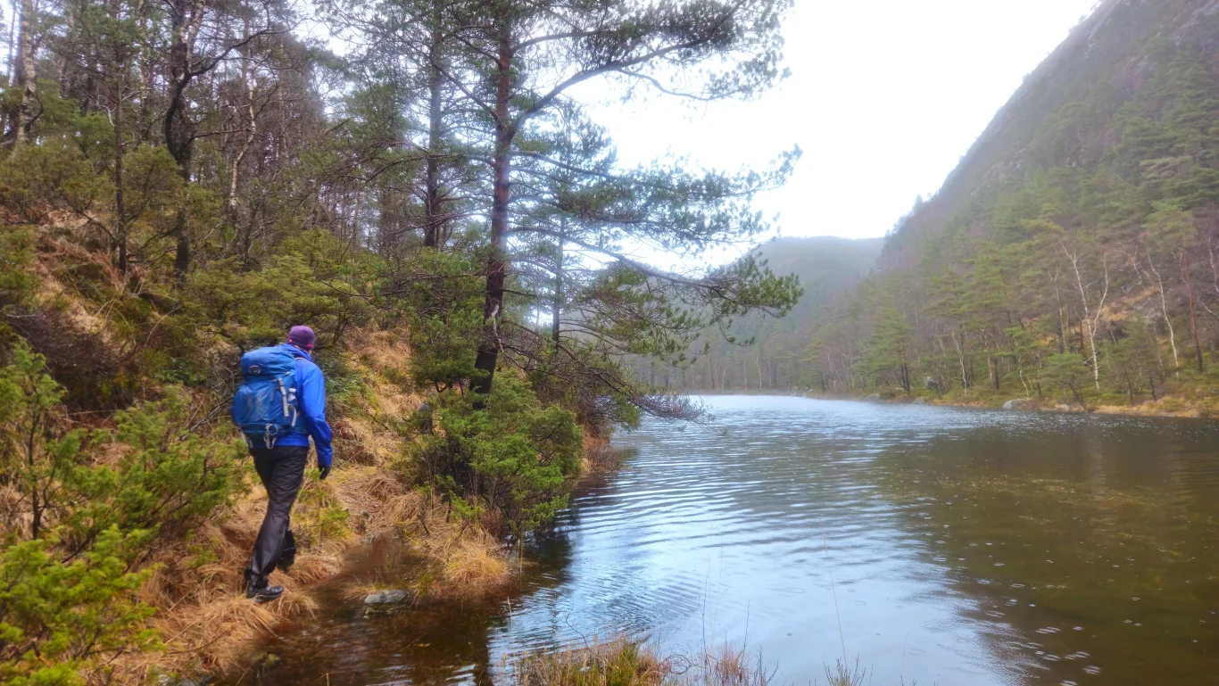 Ved enden av Langavatnet (vann nummer to) starter oppstigningen mot Brattlandsfjellet. Kryss bekken og følg sti/dyretråkk på venstre side av elven som renner ned fjellsiden. Først er det en bratt stigning gjennom skog, før terrenget flater ut ved den store myren i Øvre Skavdalen. Følg stien over myren, og kort tid etter begynner en ny oppstigning.