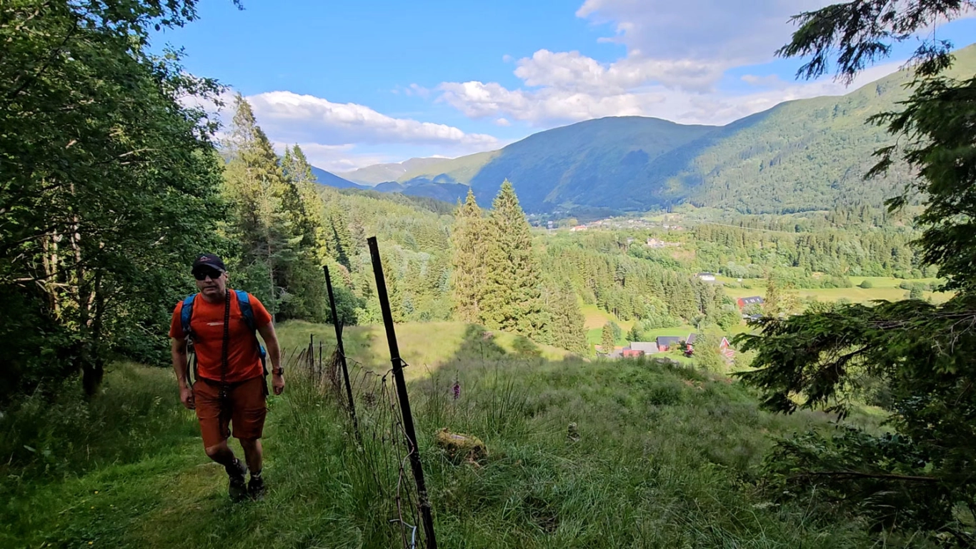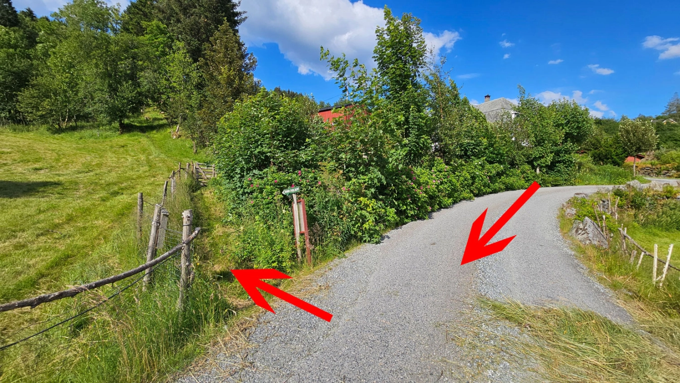 Denne ruten starter ved gårdene Øvre og Nedre Brattland. Fra parkeringen ved grusområdet går du til Brattlandsvegen og følger den ned bakken til venstre. I bunnen av bakken finner du et skilt, og stien starter på høyre side. Følg stien gjennom grinden og opp gjennom skogen til du kommer til en ny grind. Nå kommer du inn på en skogsvei. Følg skogsveien som slynger seg oppover fjellsiden forbi beitemarker.