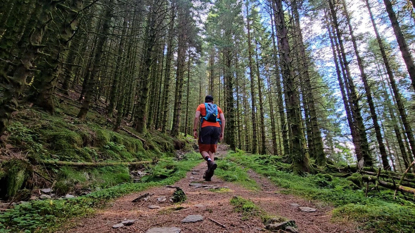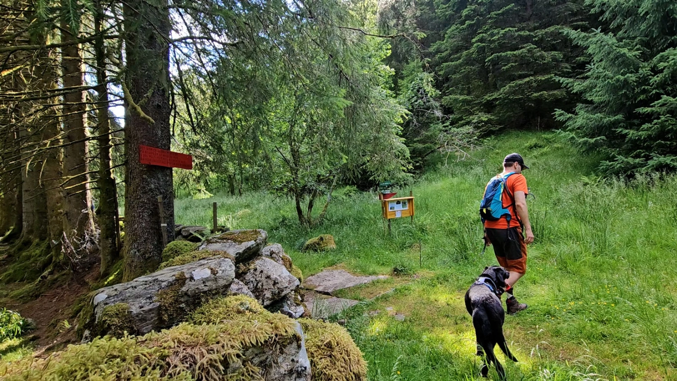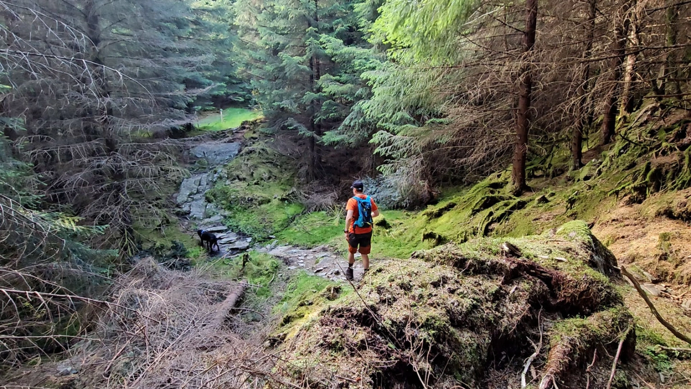 Et stykke oppe i lien kommer du til et stort stikryss med mange skilt. Her skal du gå til høyre, skiltet "Ulriken". Fortsett på den nye stien opp gjennom skogen og deretter gjennom granskog.