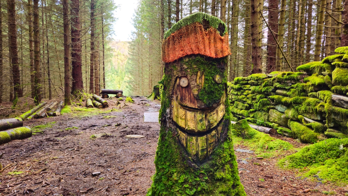 Etter et stykke svinger stien inn i granskogen, hvor du vil oppdage trær utsmykket som morsomme figurer med luer. Følg stien ned til en ny skogsvei som leder deg tilbake til startpunktet. God tur!