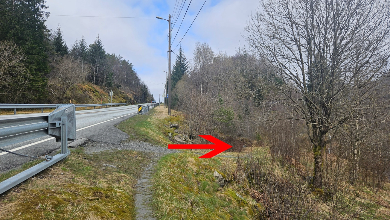 Fra parkeringen følger du stien langs autovernet til hovedveien ca. 150 meter. Der går det en vei ned mot hyttene på nordsiden av Øyjordvatnet.