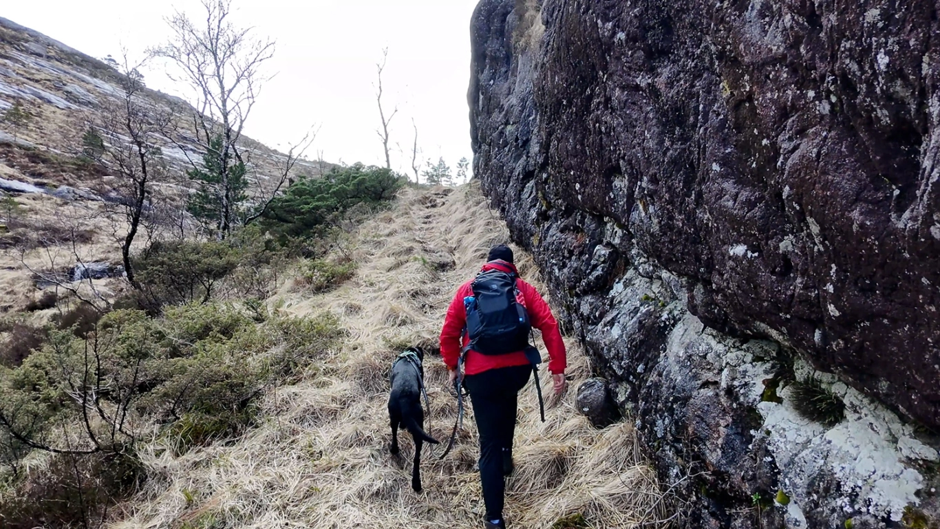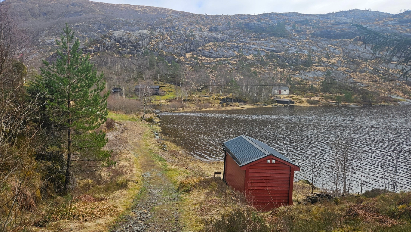 Ved elvemunningen som renner ut i vannet, krysser du en bro og fortsetter nordover gjennom hyttetunet. Gå forbi den siste hytten, og følg stien som runder rundt på baksiden og videre opp i skaret bak vannet. Her går stien et stykke langs en fjellvegg. Kort etter får du øye på en steinvarde på venstre hånd – ta av ved denne og følg stien som leder opp til det første platået, kalt "Skåpet".