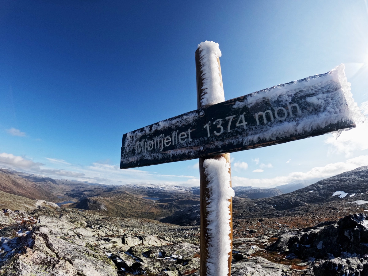 Mjølfjellet består av to topper. Denne turen går til Mjølfjellet nord (1374 moh). For lengre tur kan du fortsette videre til sørtoppen (1470 moh) Retur samme vei.