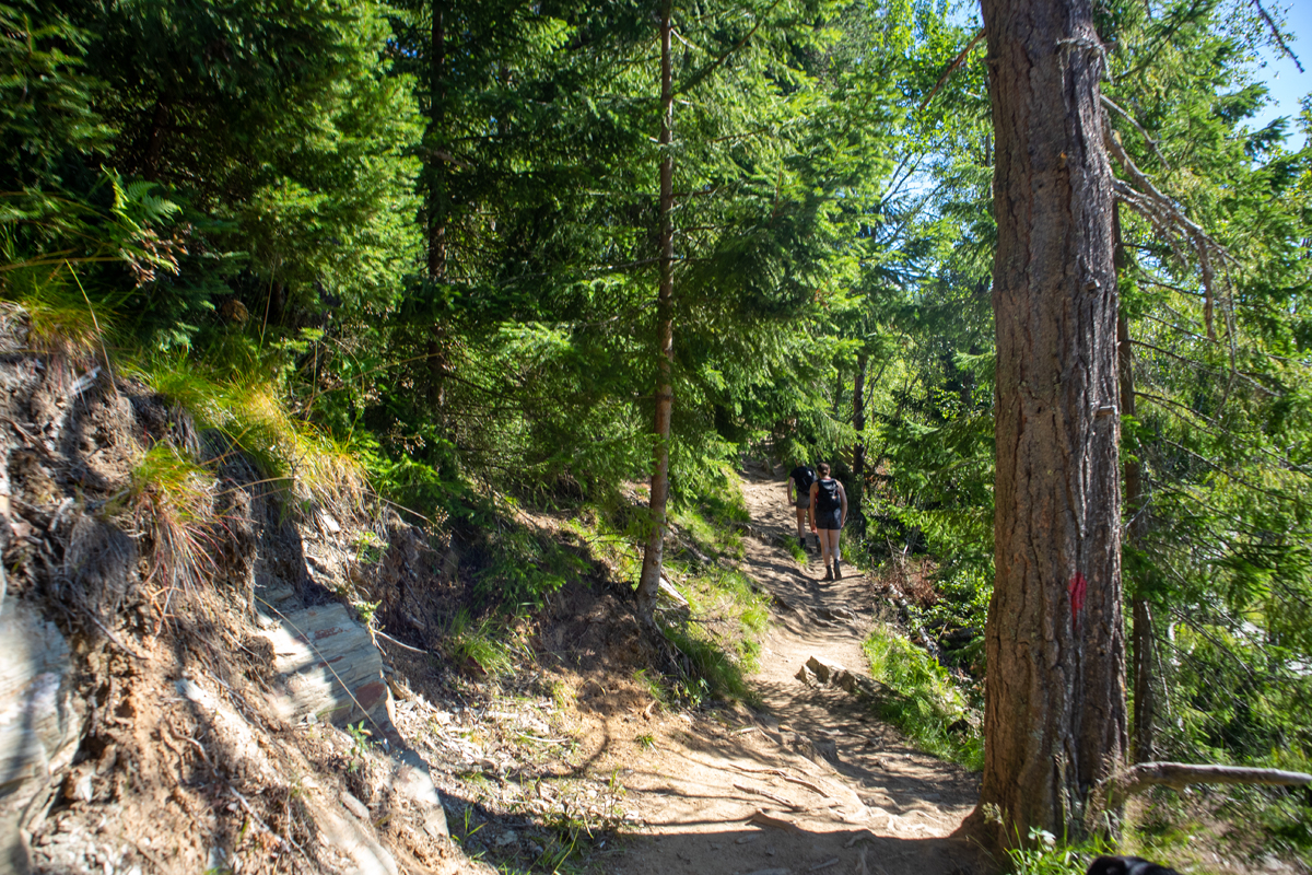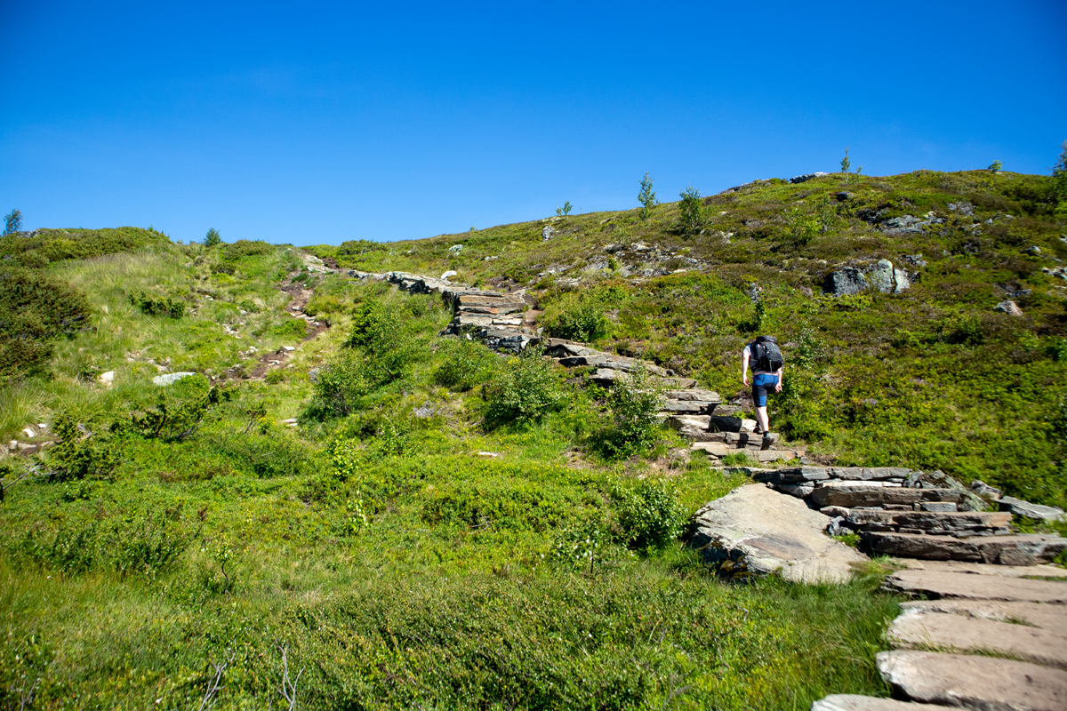 Her fra svinger stien mot venstre og du må opp et bratt parti og videre på nye sherpatrapper. Nå følger en lang oppstigning langs ryggen før en flatere stigning mot toppvarden.
