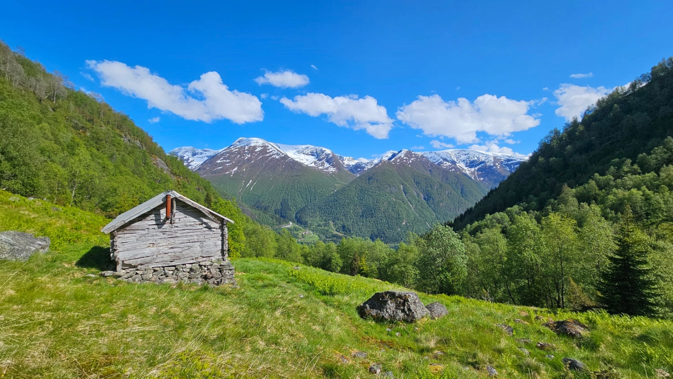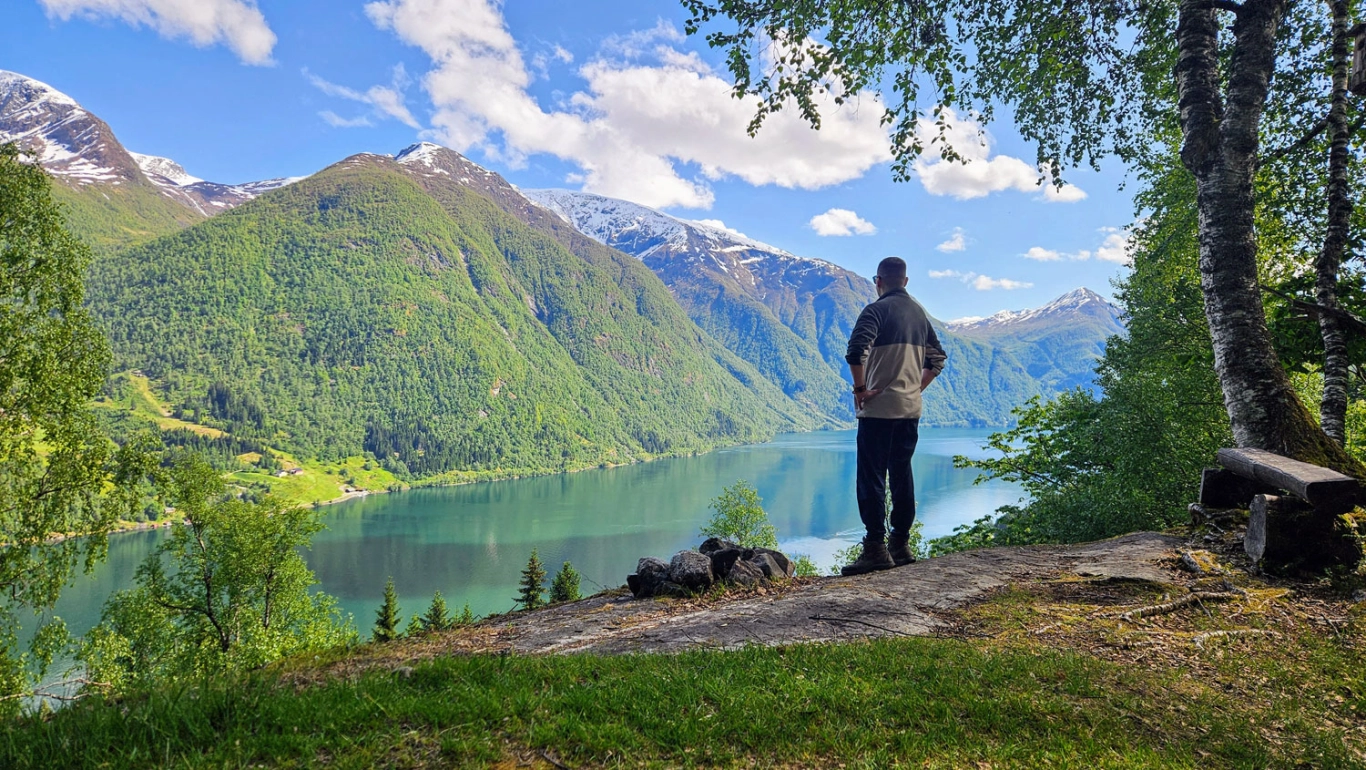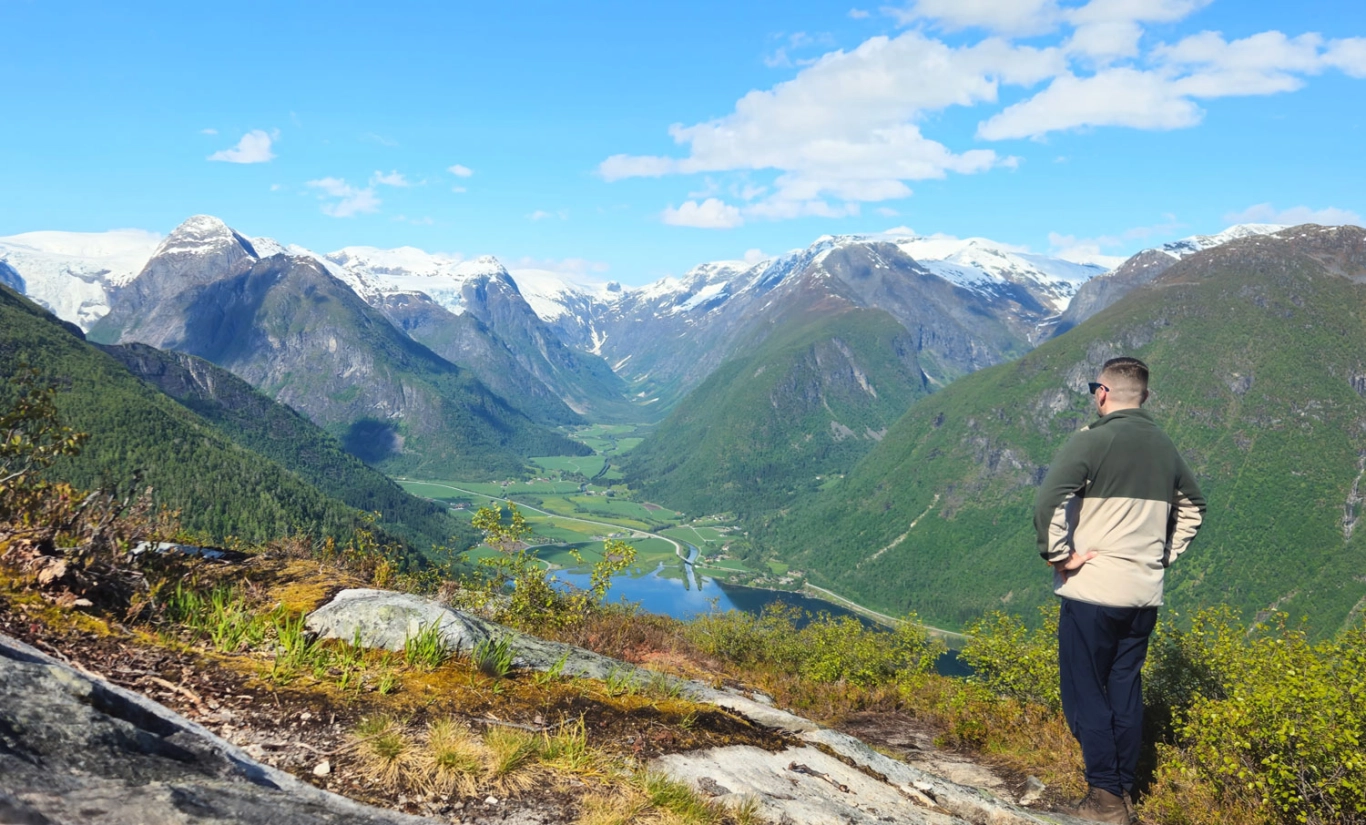 Toppen byr på flott utsikt innover mot Fjærland, og du ser også Jostedalsbreen og noen av brearmene.