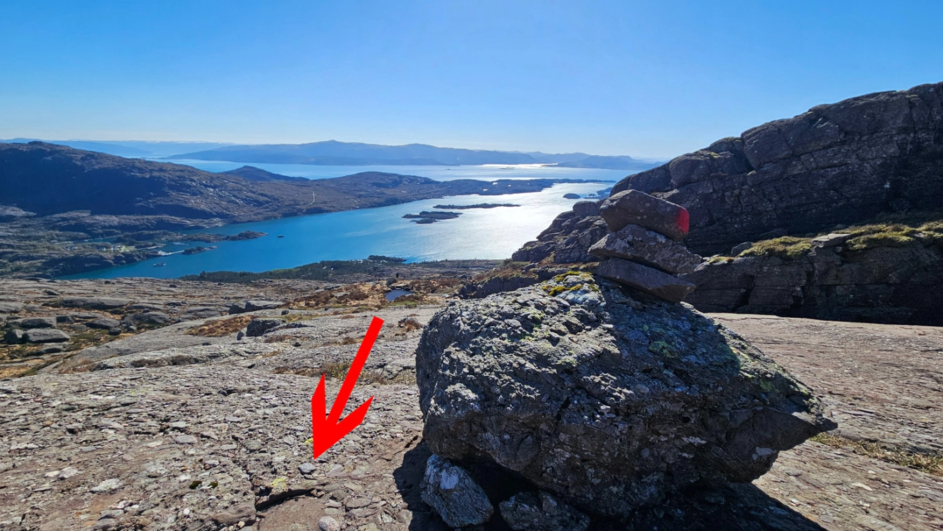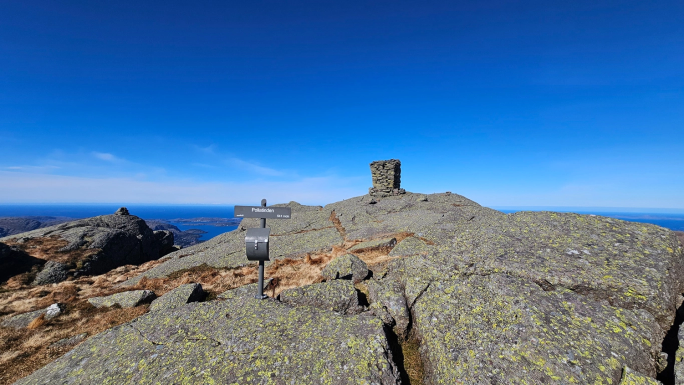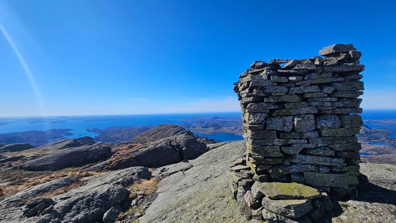 På toppen står det en stor varde, et skilt og en postkasse. Her får du en fantastisk 360-graders utsikt over Sula og Solund. Mot nord kan du se både Alden og Bulandet.