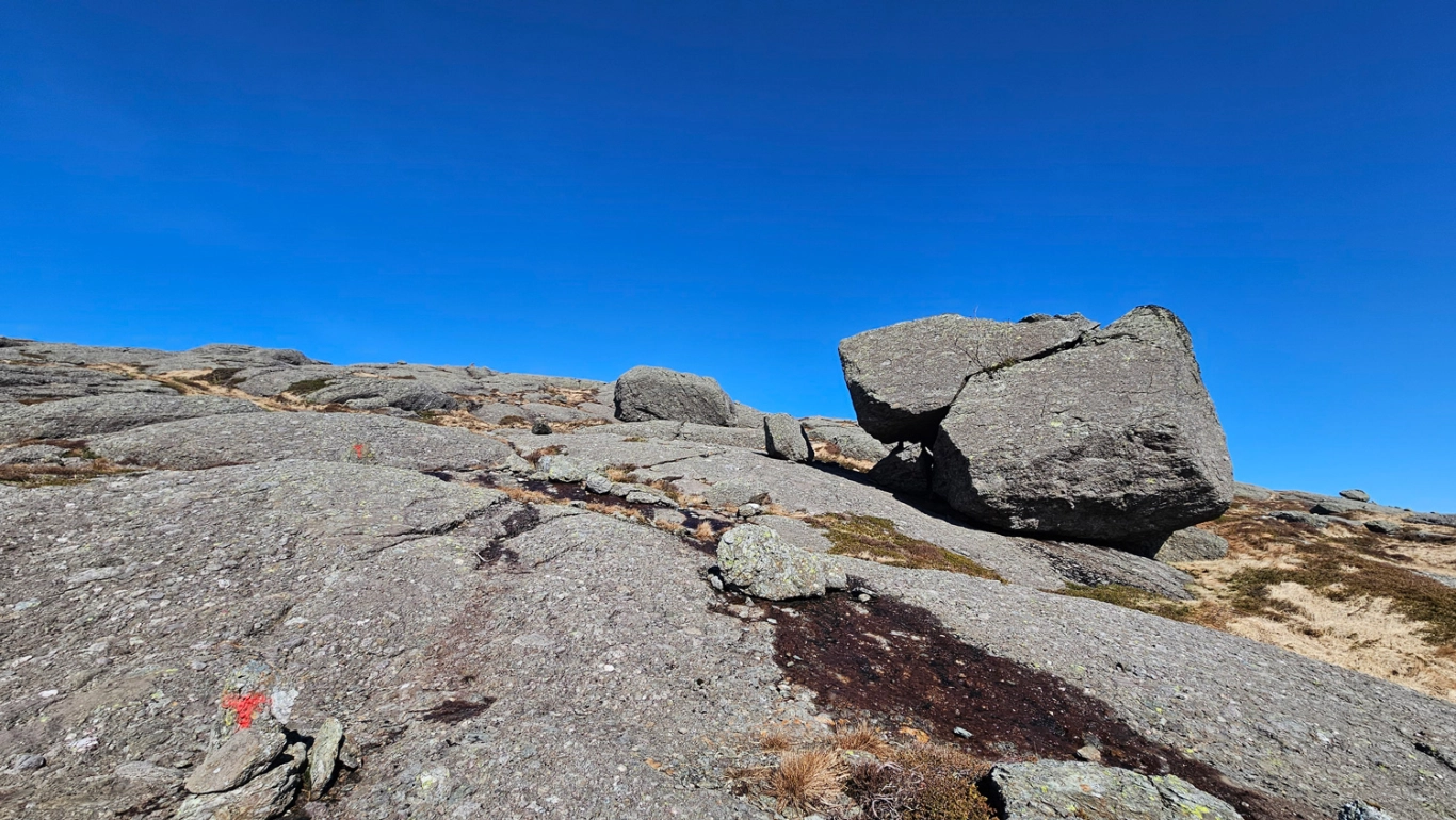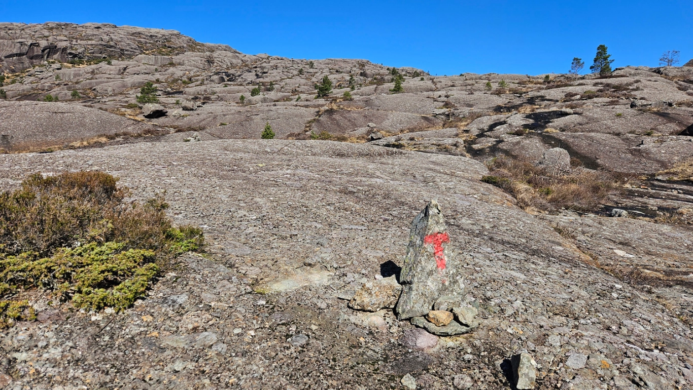 Herfra går hele turen i fjellterreng på berg og stein med jevn stigning mot toppen. Enkelte partier er brattere enn andre. Hele ruten er merket med små, rødmalte steinvarder. Vær forsiktig dersom det har regnet, da fjellet kan være glatt. I tørt vær gir underlaget overraskende godt feste.