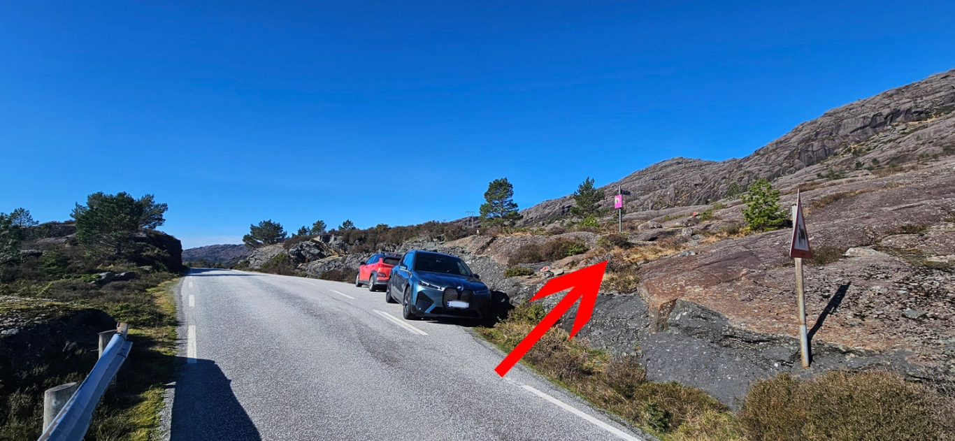 Fra parkeringsplassen følger du hovedveien ca. 50 meter til du ser en p-lomme og et skilt merket "Pollatinden".