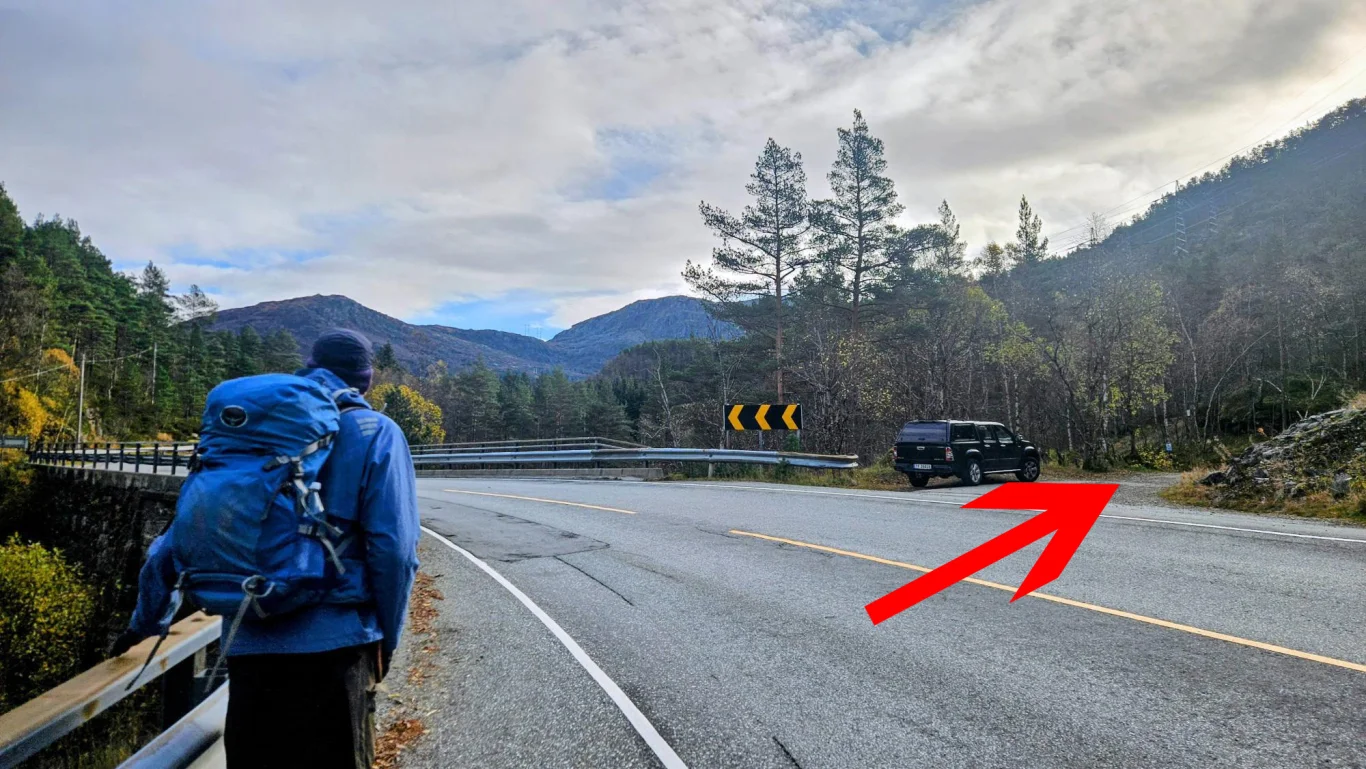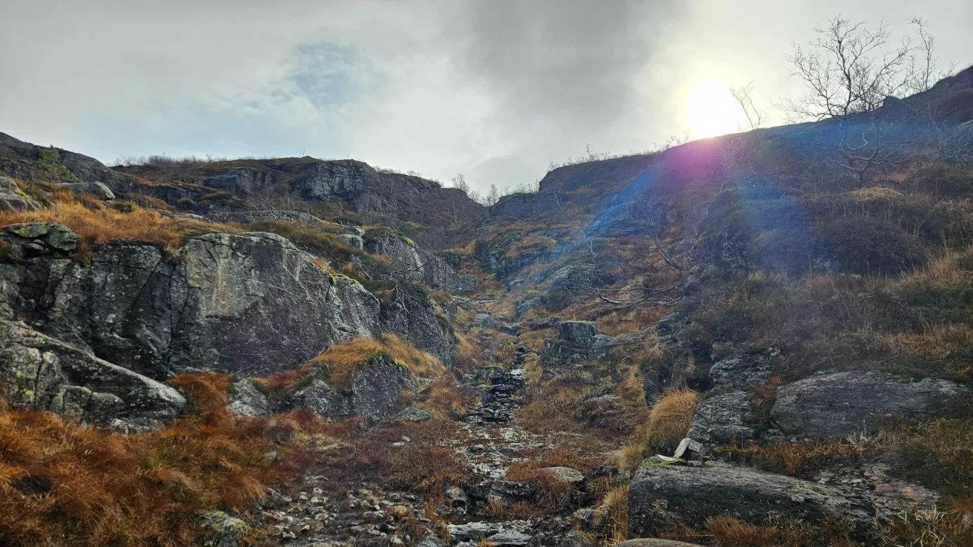 Du fanger snart opp et nytt tråkk/dyretråkk. Følg dette på venstre side av Storagrønova, først ned gjennom et skar og deretter noen hundre meter langs fjellsiden. Ta deretter bratt opp til høyre gjennom et nytt skar (noen små varder). Runder du videre, kommer du inn på baksiden av fjellet.