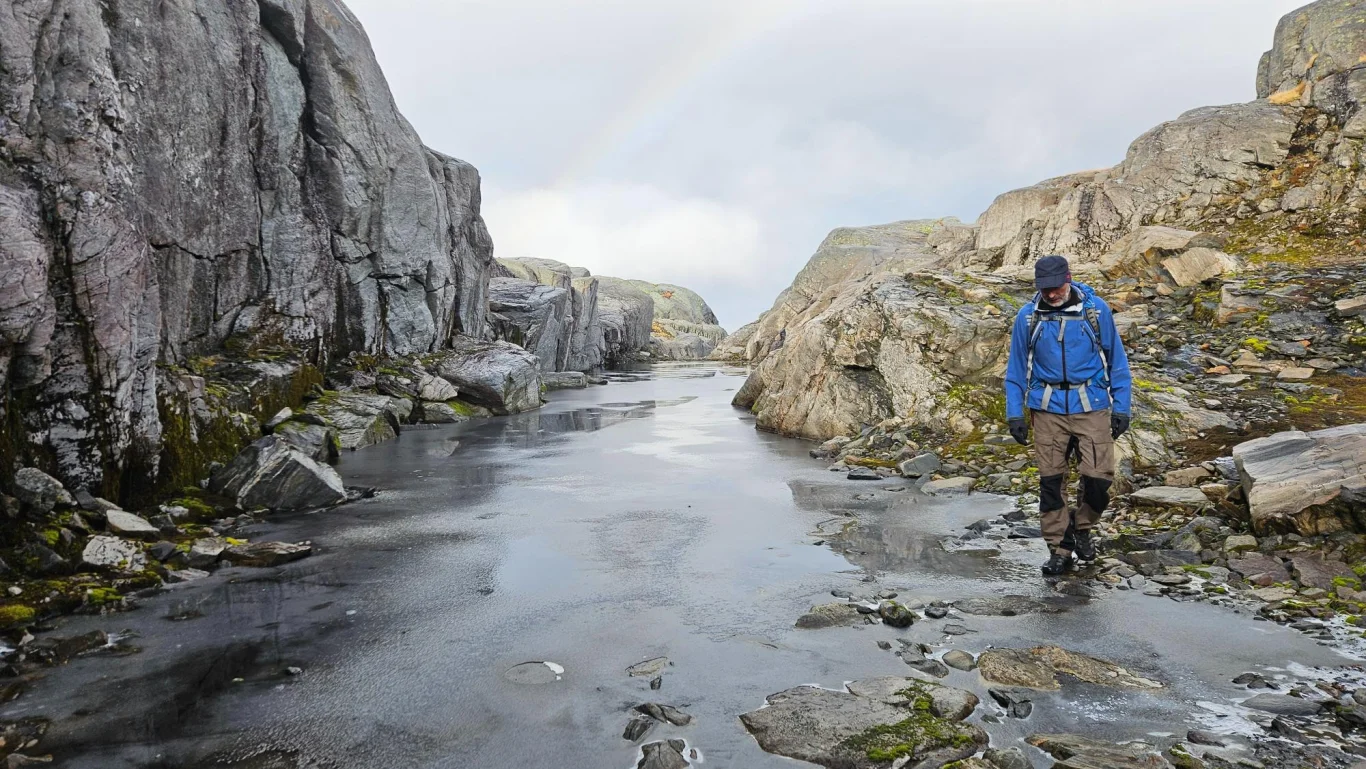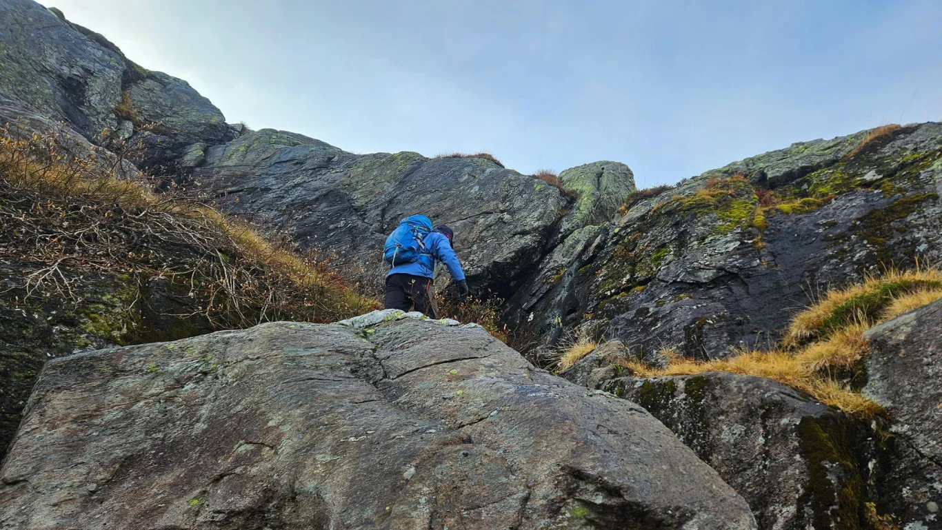 Her er det et kort parti med lett klyving før du er oppe på platået. Fortsett nordover mot kanten og toppunktet. Retur samme vei.