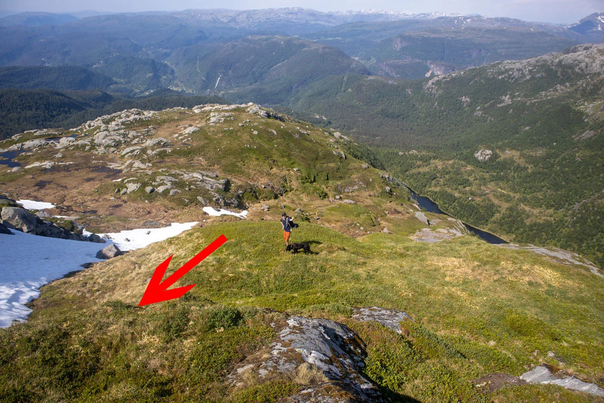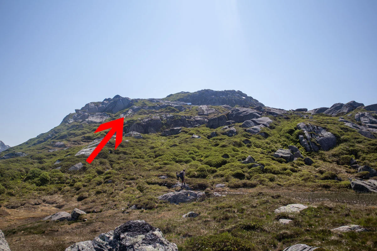 Skal du gå til toppen av fjellet, må du fortsette ca. 300 meter innover.