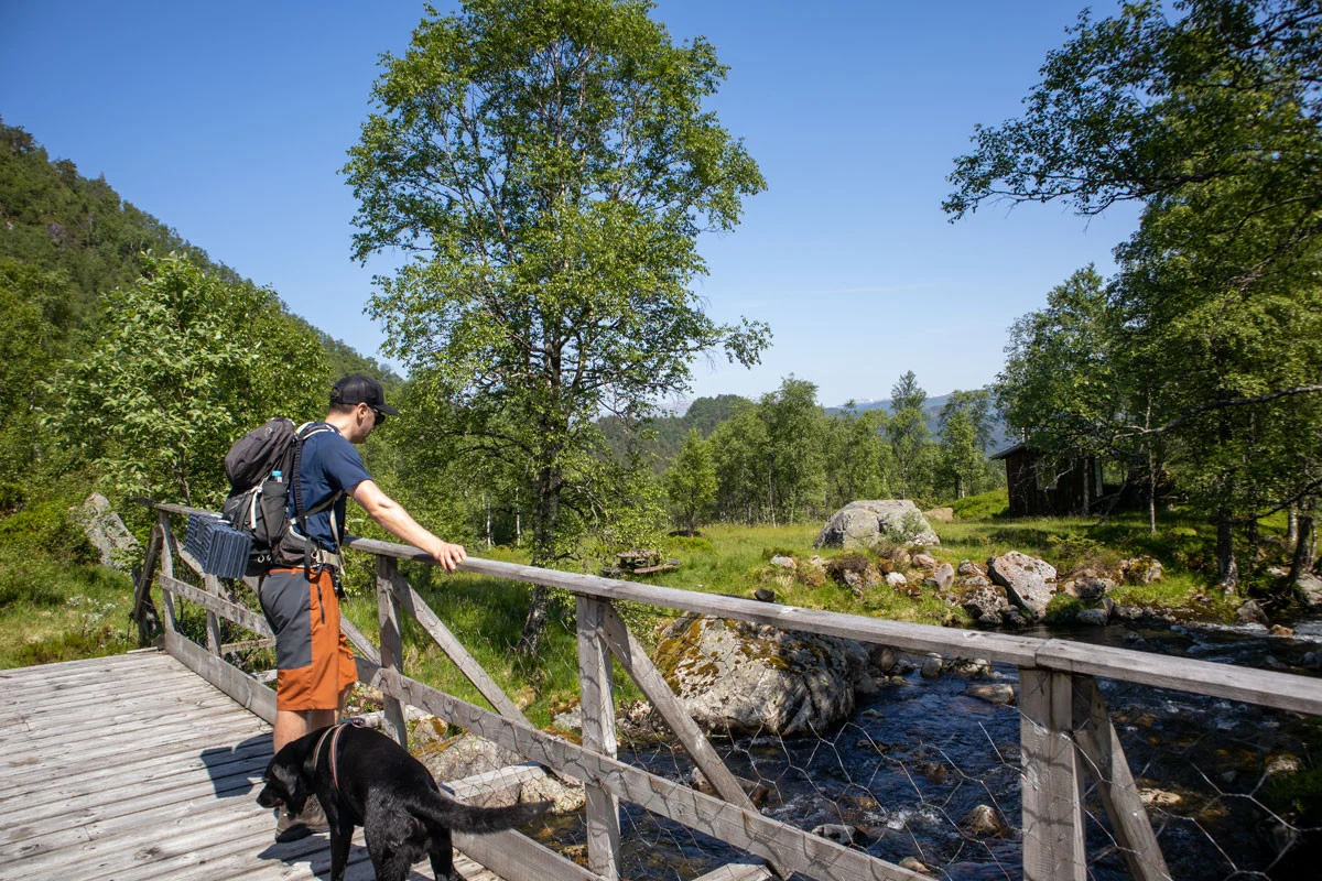 Gå til høyre i første veikryss og videre retning sørvest. Du kommer nå til en jaktkoie. Her går du over broen. Nå er det slutt på alt som heter vei og sti. Det er heller ingen merking.