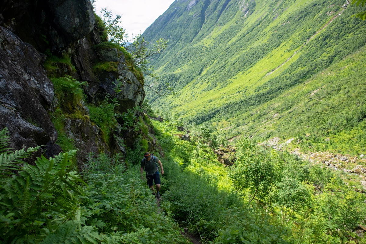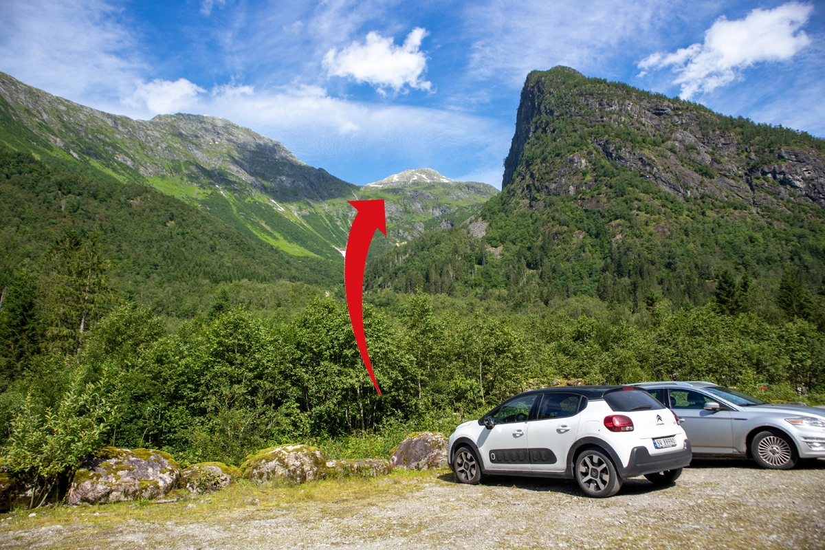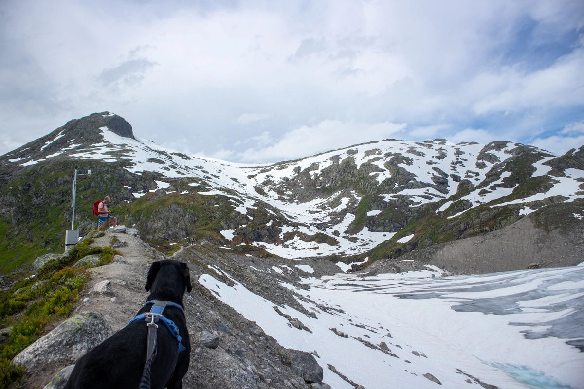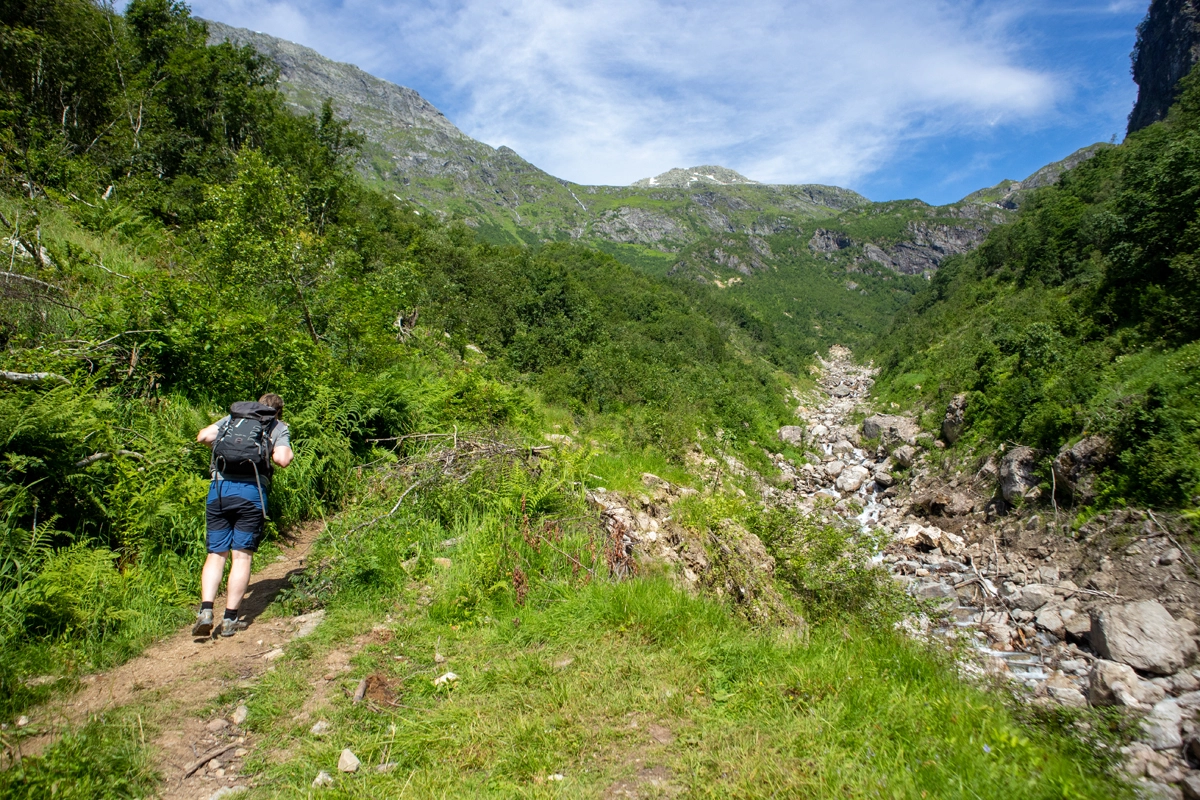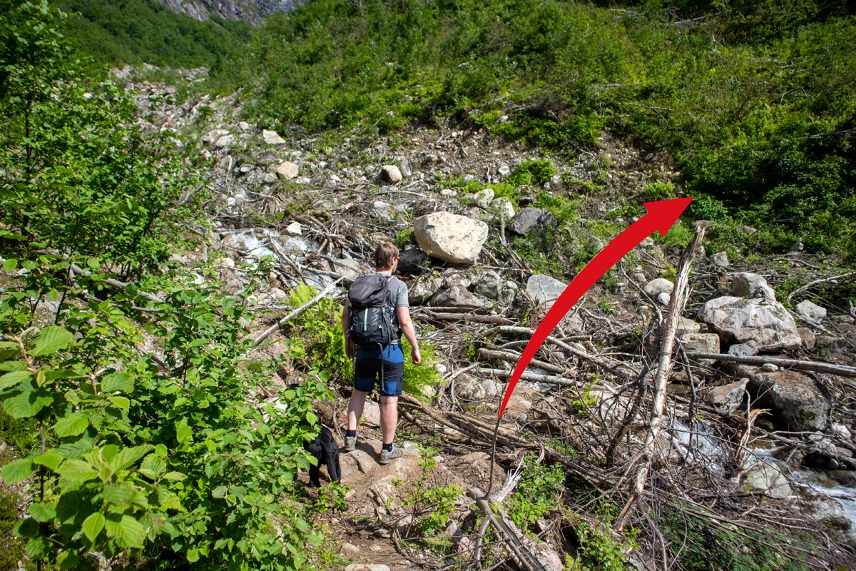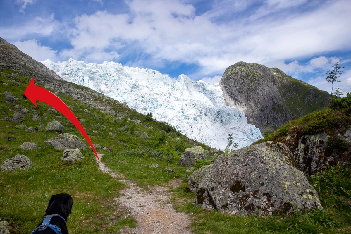 Den mest brukte "vanlige" stien opp til breen og hytten er til venstre, men for den ultimate opplevelsen anbefaler vi å gå til høyre.