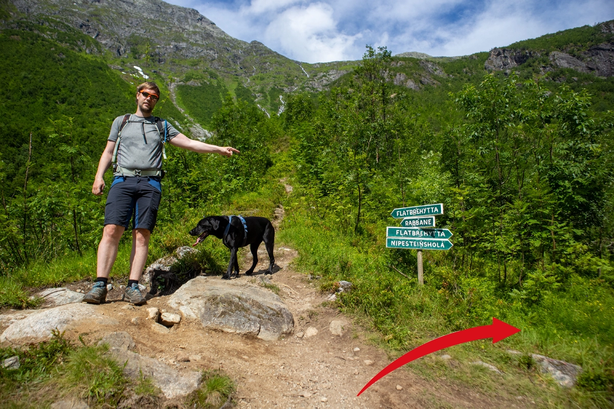 Ta returen på stien som leder ned på høyre side av hytten. Da kommer du ned i stikrysset hvor vi tidligere gikk til høyre.