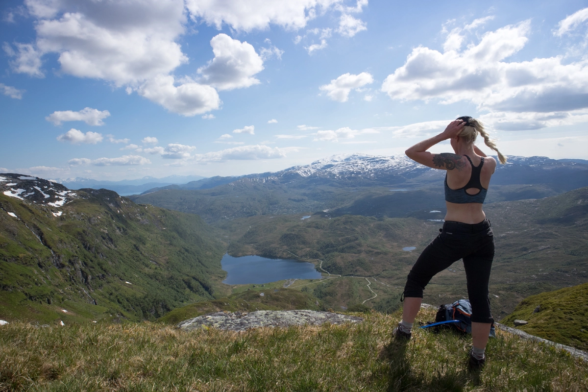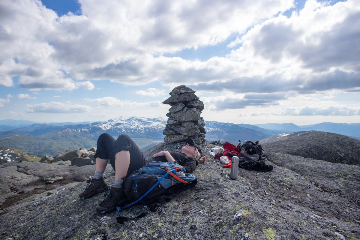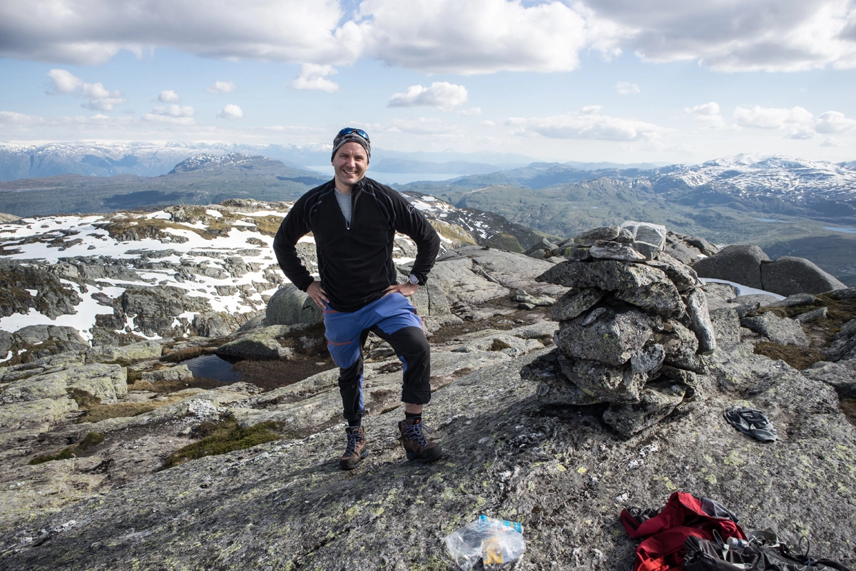 På toppen er det en liten varde. Ingen bok dessverre. Utsikten mot nærliggende fjell er i toppklasse.