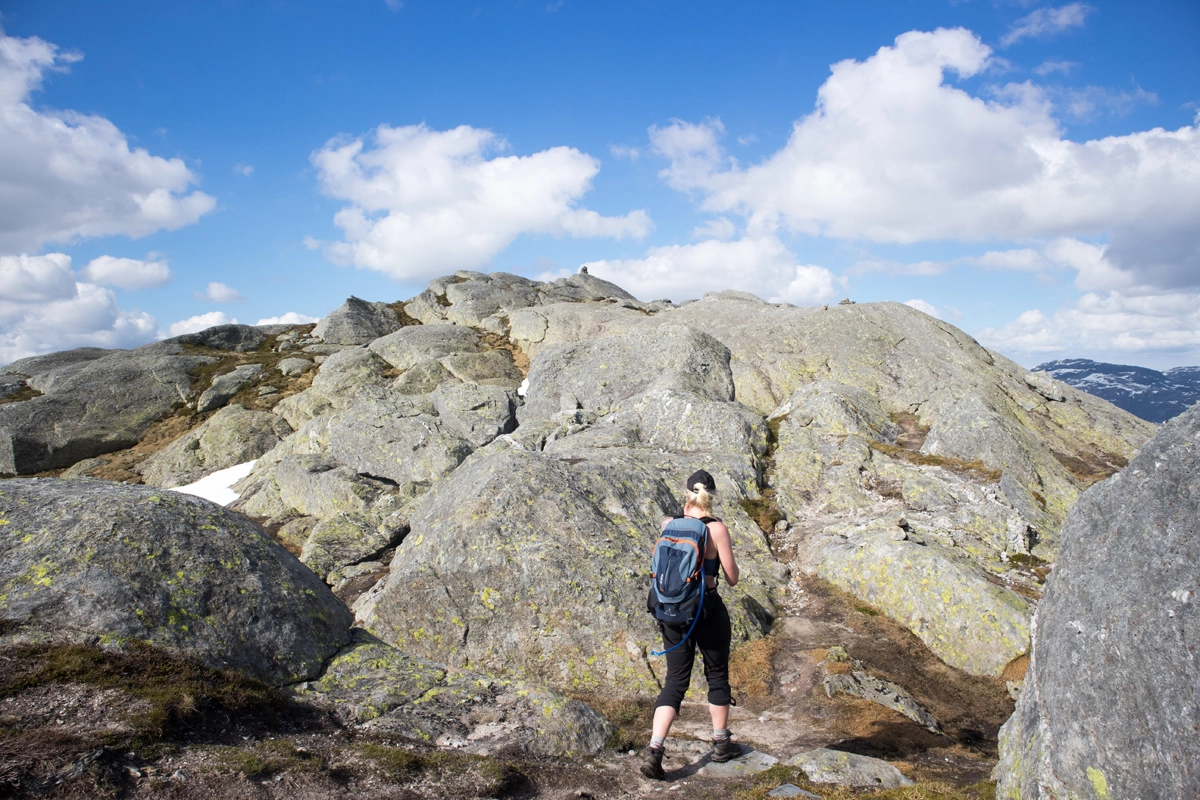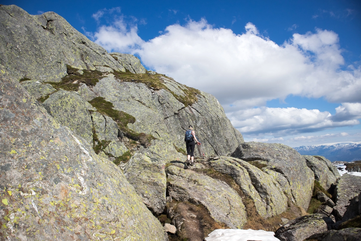 Siste del av turen er ikke like bratt. Her snor stien seg sikksakk mellom mange morsomme steinformasjoner. Stien er god nesten hele veien, og det er merket med røde malingsflekker.