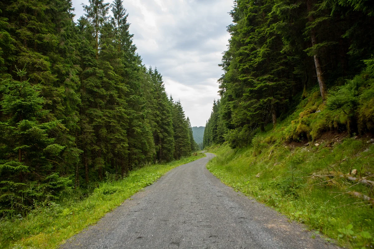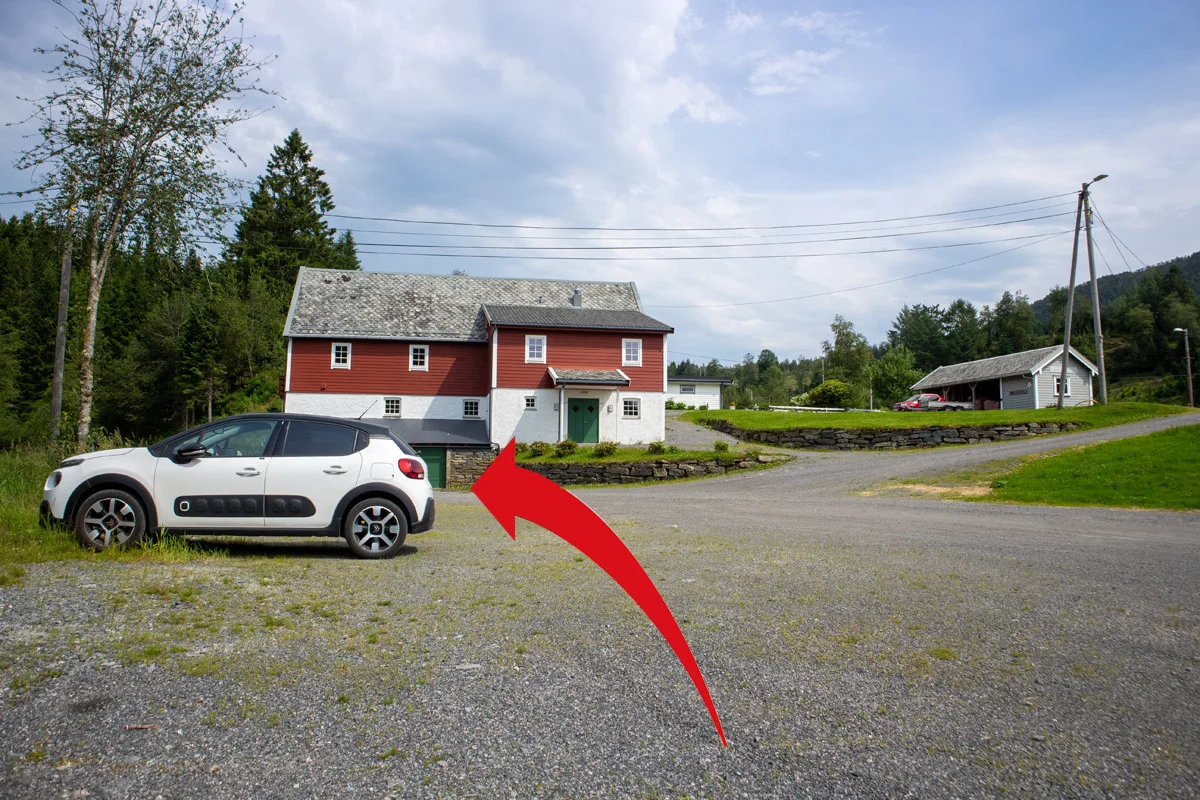 Ved enden av veien skal du gå til høyre og følge grusveien gjennom bommen og til Bontveitvegen. Gå de siste 400 meterne langs Bontveitvegen til parkeringen.