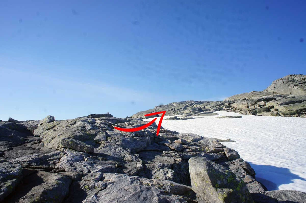Stien oppover fjellsiden er dårlig. Så følg godt med etter rødmalte små varder. Terrenget er steinete og ulendt. På ca. 1100 meter flater det ut. Deretter er det en siste stigning opp Gjønakvitingen.