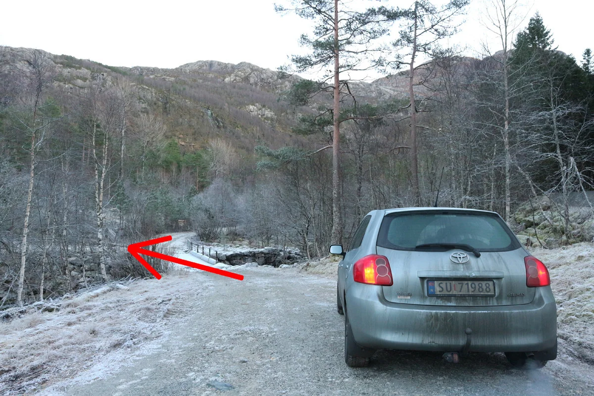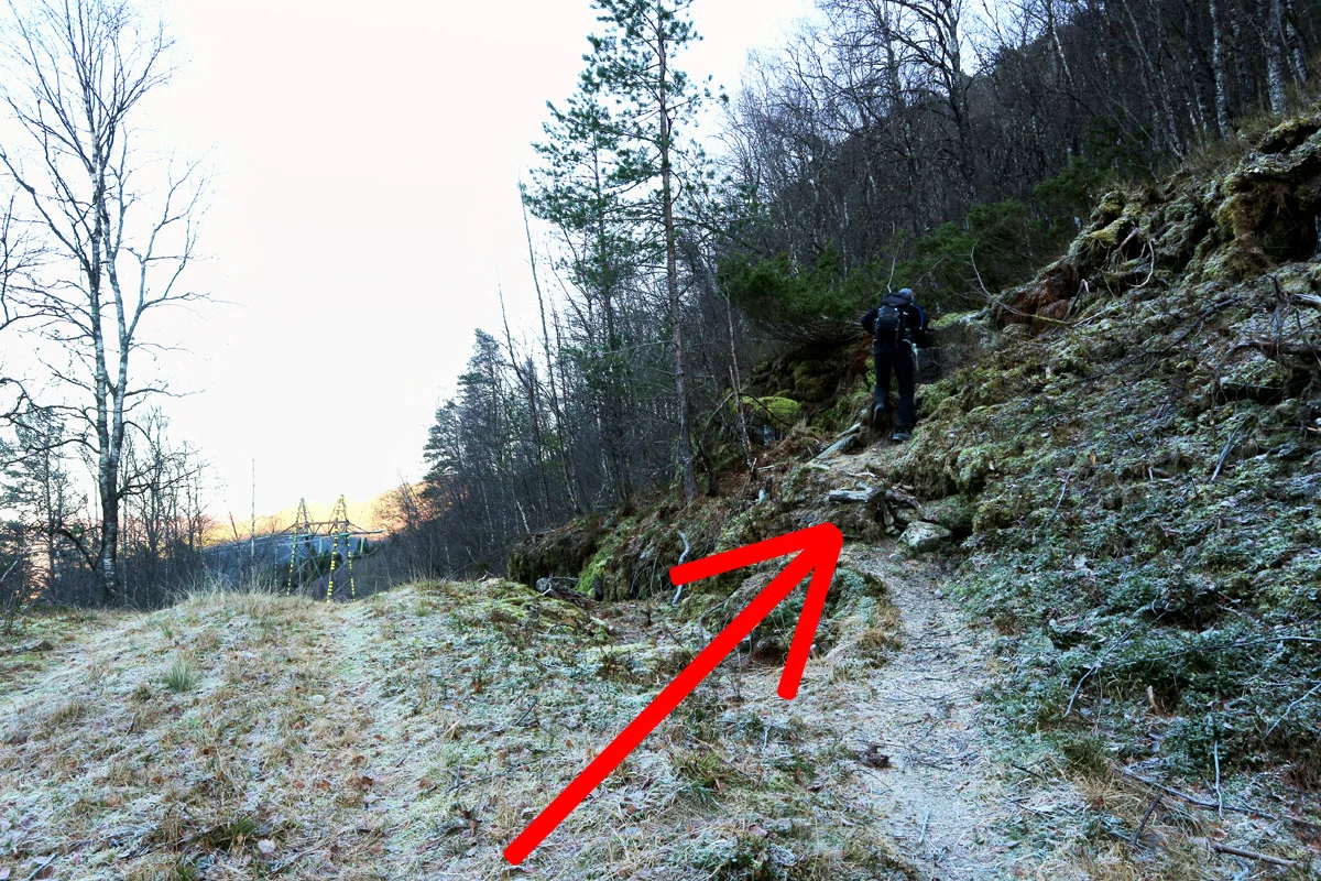 Fra parkeringen følger du skogsveien. Kryss broen og gå til venstre i første skogsveikryss. Følg skogsveien til du er på toppen av en bakke, ca. 500 meter fra løypen. Finn en skogssti som begynner på høyre side. Følg skogsstien helt til jakthytten på ca. 800 meter. Det meste av stien til hytten er lett å følge, men enkelte steder er den utydelig. Da er den merket med små varder.