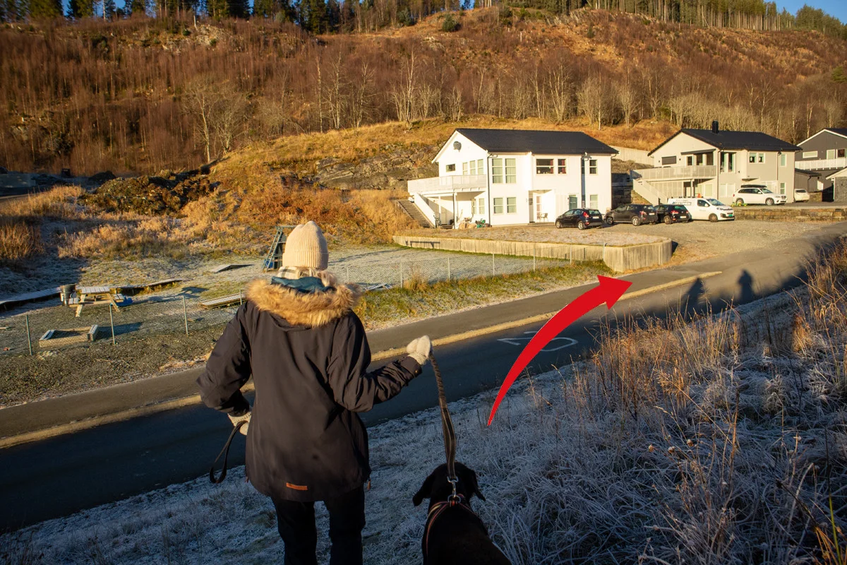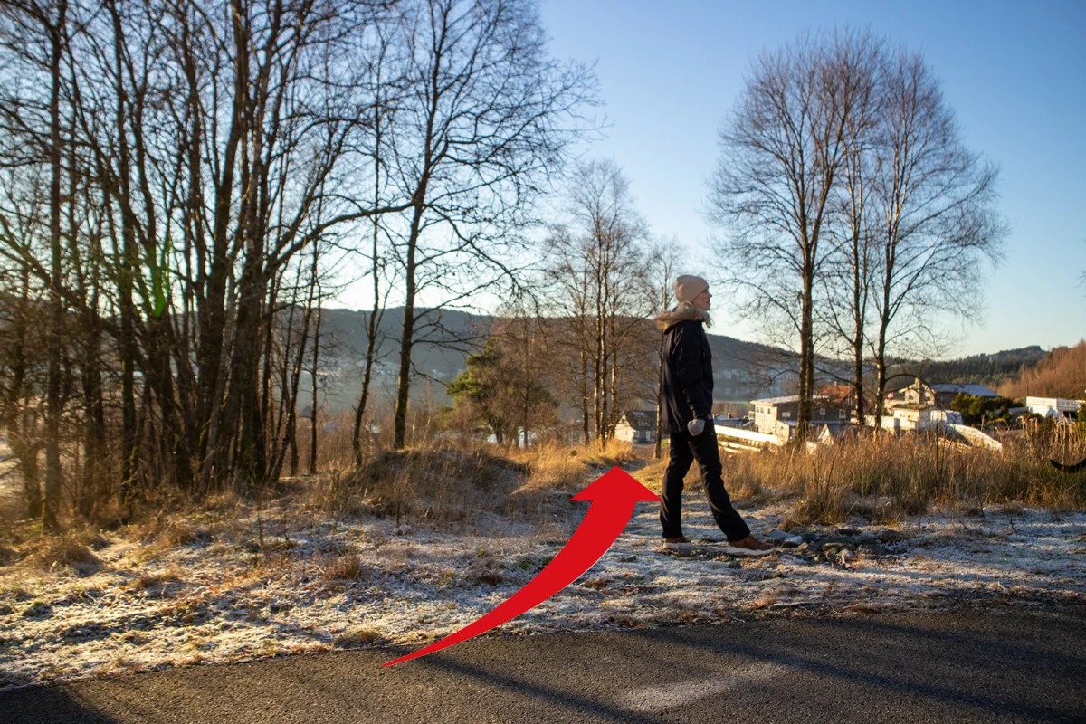 Følg asfaltert vei videre nordover forbi hus og hytte på høyre side. Ca. 100 meter etter huset går det traktorvei til høyre. Gå inn her og til enden hvor det er satt opp gjerde. Få venstre side av gjerde er det ikke piggtråd. Gå over gjerdet her og videre nordover over beitet. Gå ned til Hedne og veien til venstre "Hedneveien" som går opp til Hednefjellet. På toppen går du forbi alle hyttene og til venstre etter bommen.