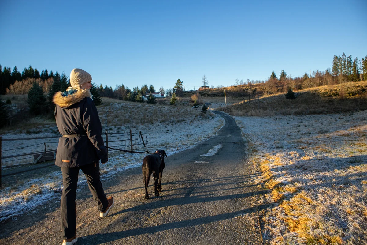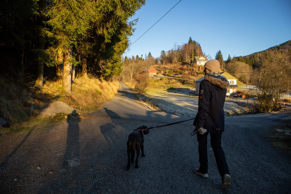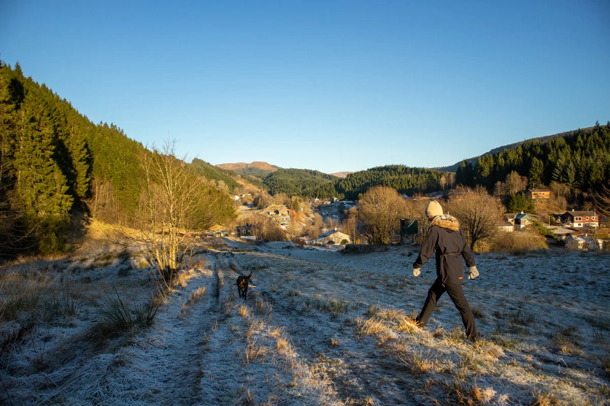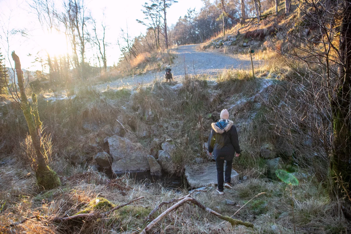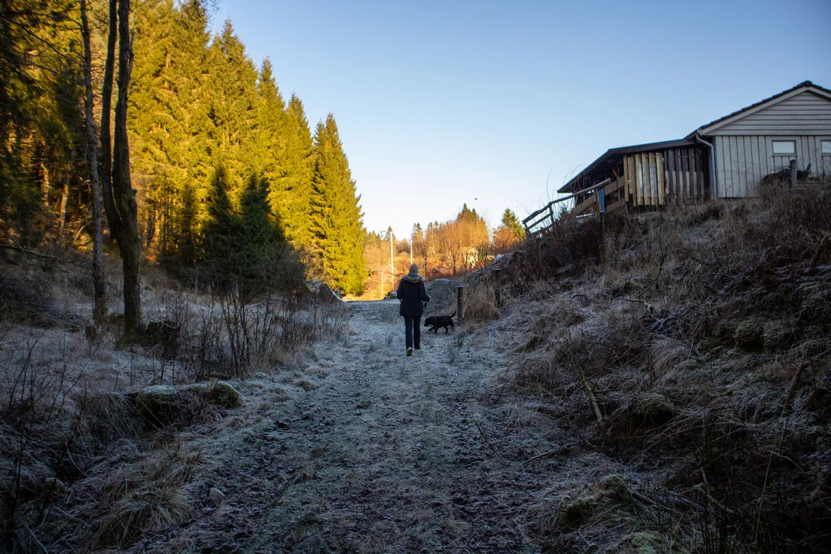 Returner tilbake til grusplassen, og derfra går du merket sti ned smådalen til du ankommer hovedveien. Følg fortau langs Osveien og deretter opp Bontveitvegen til start.