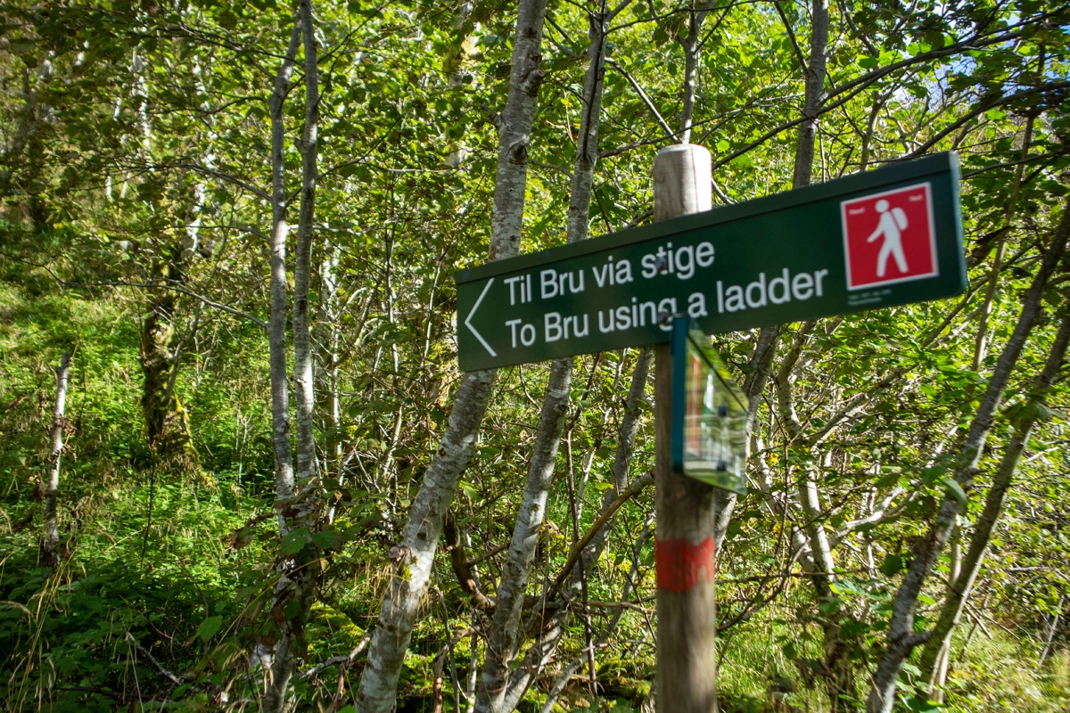 Stien klatrer på kryss og tvers opp fjellsiden mot stigene. Det er 2 stk. av dem. Først en kort stige og deretter en lang. Veldig spesiell opplevelse.