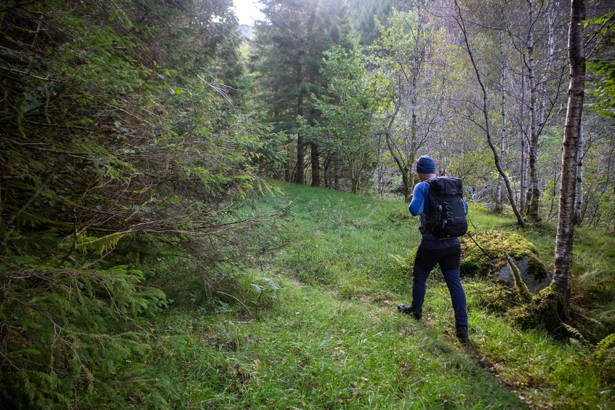 Gå i hjørnet av innmarken mot skogsveien som begynner like oppe i skråningen. Den går først mot venstre og så svinger den til høyre og følger høyspentmasten. Etter stykke flater det ut og du går på fin sti innover på venstre side av elven. Etter 1 km. kommer du til stikryss hvor du kan velge å gå via stigen eller gå rundt. Vi valgte stigen. Denne veien er bratt og passer i for de med høydeskrekk. Om du går rundt er det ca. 1 km lengre.