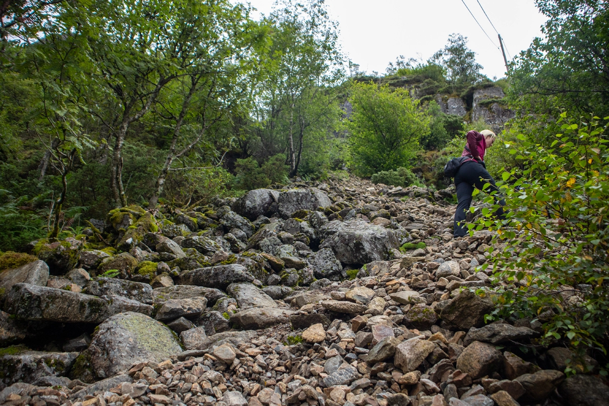 Det er steinene og en del glatte røtter, men stien er tydelig og lett og følge. På ca. 325 moh. må du opp en bratt steinrøys. Gå forsiktig her. Et stykke lengre opp er det lagt ut tau. Like ovenfor steinrøysen flater terrenget ut og utsikten blir god. Følg siste del av stien som går på kryss og tvers opp til Løvstakken varden.