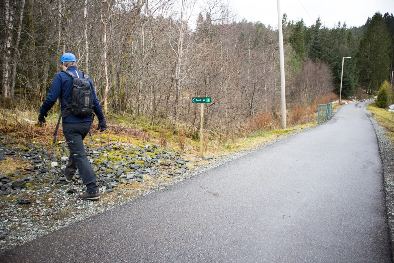 Følg gangveien/sykkelstien langs Kalandsvannet ca. 1 km. Her vil du se skilt på venstre side "Turvei / Lyshornet". Følg stien inn i skogen sørover. Etter noen hundre meter er det stikryss. Her går du til høyre. Følg stien sørover i kupert terreng. Det går opp og ned og du krysser mange bløte myrer. Turen er merket med gule trepinner i trærne.