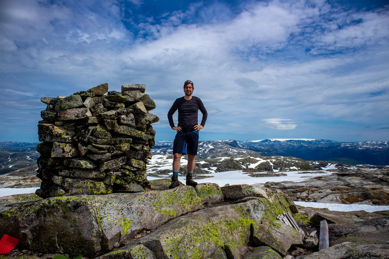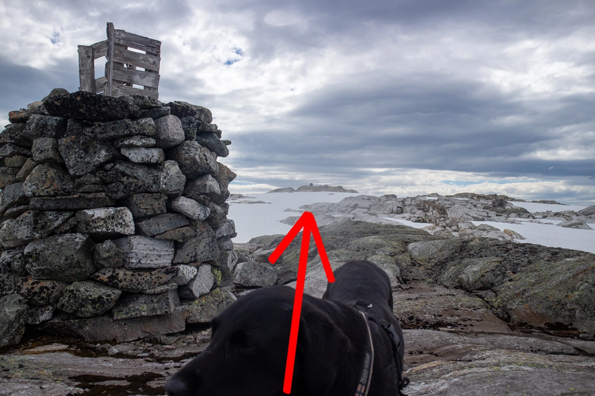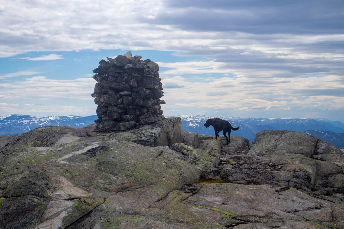 Resten av turen er det ingen sti. Men du skal følge stein vardene helt til toppen. Følg ryggen oppover mot sør-øst og deretter mot sør. Det er jevn stigning hele veien. Noen brattere partier. Det ligger mye løs steiner og snøflekker, så høye fjellsko er viktig. Oppe på platået vil du først se en lure-varde. Fortsett forbi denne og du vil se toppvarden.