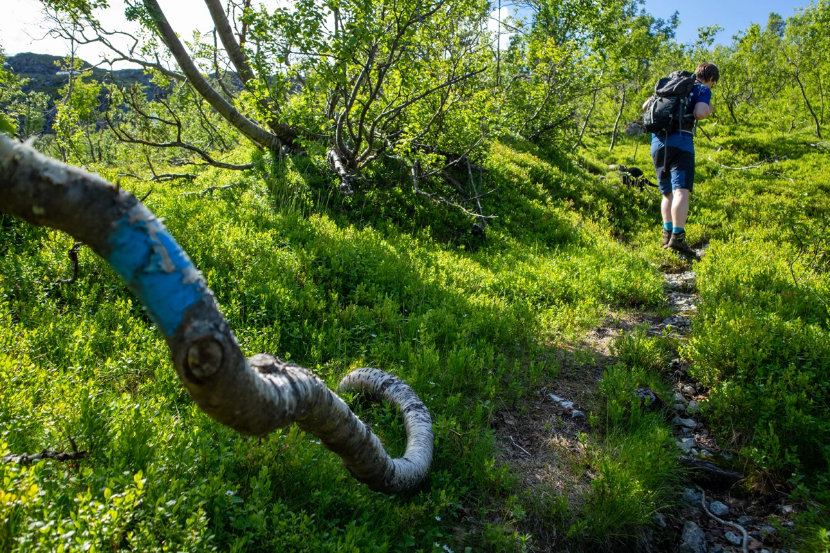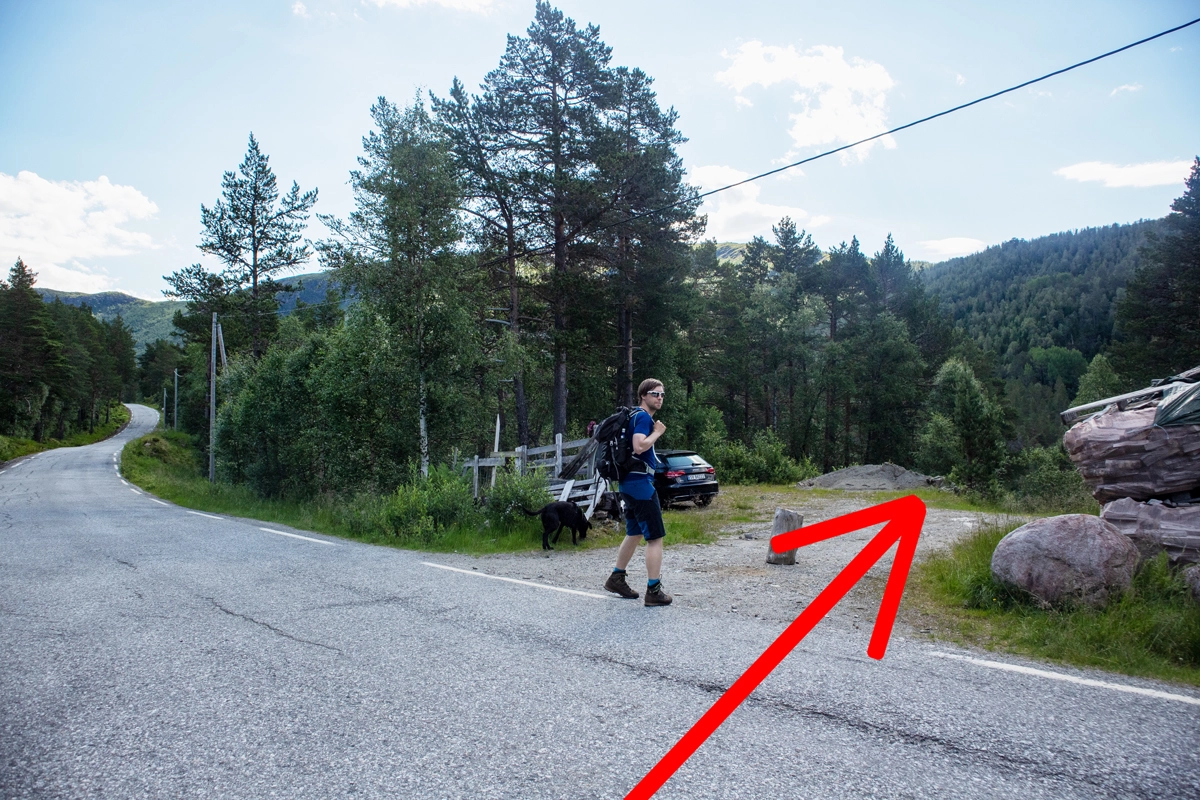 Etter broen følger du stien opp i skogen mot Tungefjellet. Like etter broen er det lett å miste stien, men det er bare å gå mot venstre så finner du den. Gå forbi Saueplassen mot venstre og deretter kommer du til en lysning (ingen trær). Gå til høre opp skråningen. Det går en dårlig sti på venstre side av lysningen. Gå rett frem gjennom skogen til det blir mindre vegetasjon. Over tregrensen forsvinner stien. Følg små stein varder opp steinuren mot Tungefjellet. Gå på venstre side forbi den store steinen. Nå blir det åpent fjellterreng. Gå mot sør-øst til toppen av Tungefjellet.