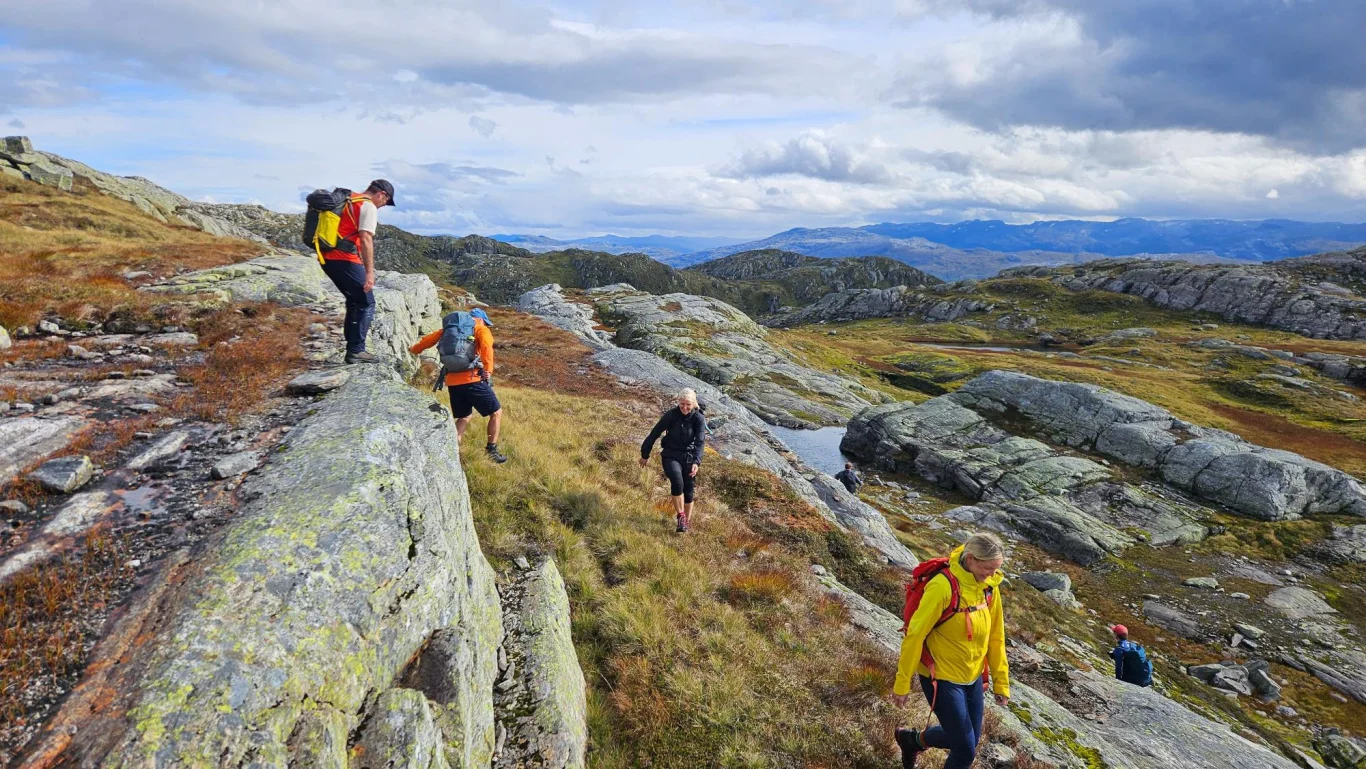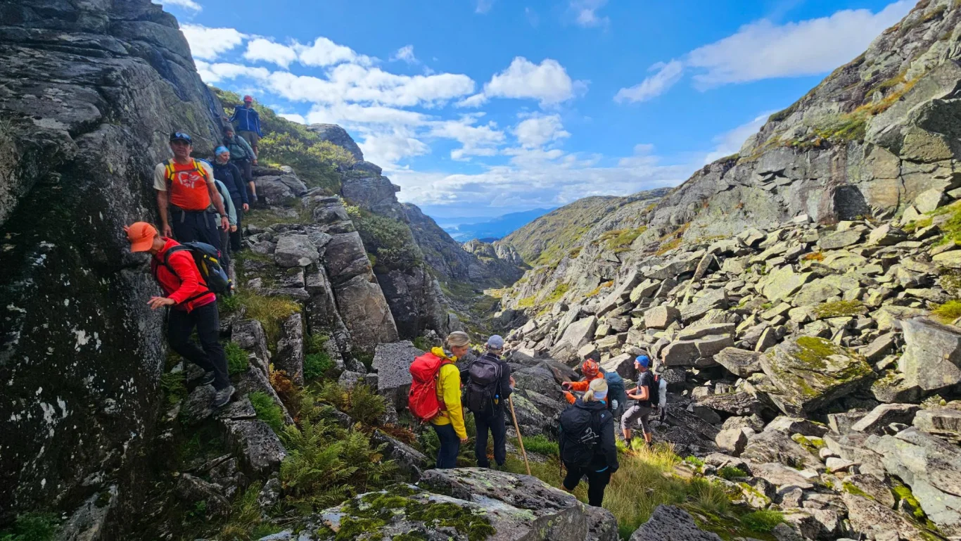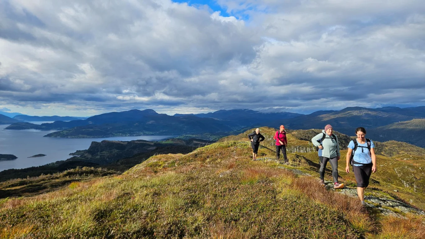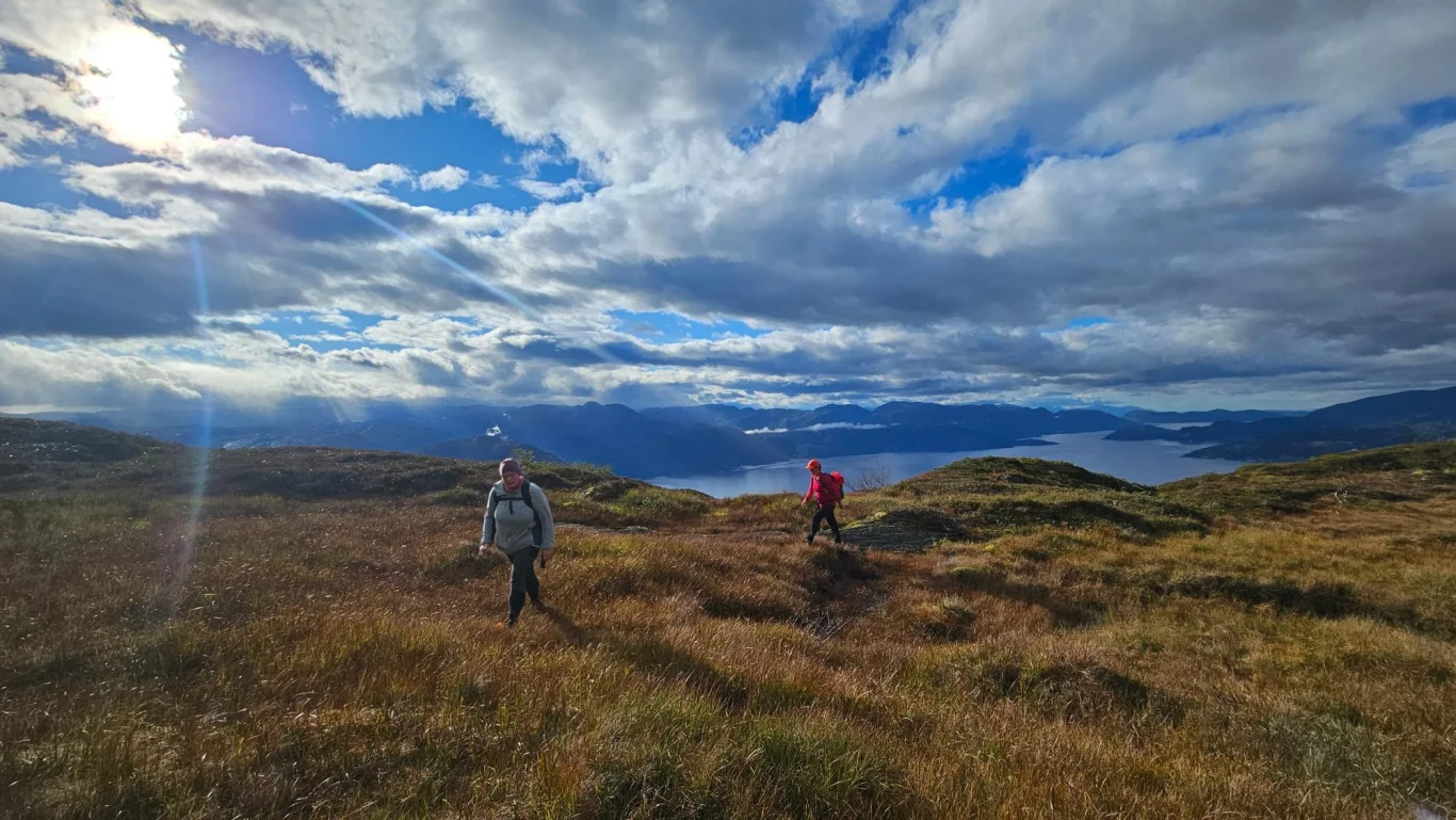 Turen byr på storslått utsikt mot Fyksefjella og utover mot Hardangerfjorden. Turen går i starten på sti og deretter delvis uten sti gjennom variert og bratt terreng. Beregn rundt 8 timer og 18 km totalt, med 1300 høydemeter opp og ned. Perfekt for erfarne fjellvandrere.
